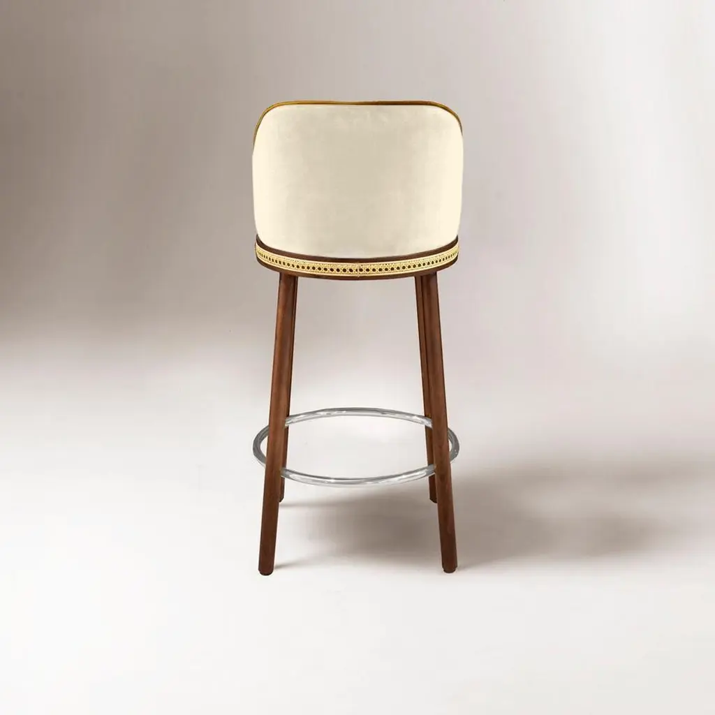 Alma counter & bar stool. As any admirer would experience gazing at its muse, it is impossible not to feel enchanted and almost hypnotized by the refined, sensual lines and the delightfully charming soul of Alma Bar Stool. In a piece that combines classic and modern aesthetics we can find a certain harmonic gracefulness paired with an intimate voluptuousness that can embrace you and surprisingly break the frontiers of sophistication and elegance.MaterialUpholstery: fabric or leatherStructure: solid wood: natural walnut and natural oakRattan: natural rattanFeaturesSeat style: roundSeat back type: sLow backWeight capacity: 400 lb.Footrest included: Yes.