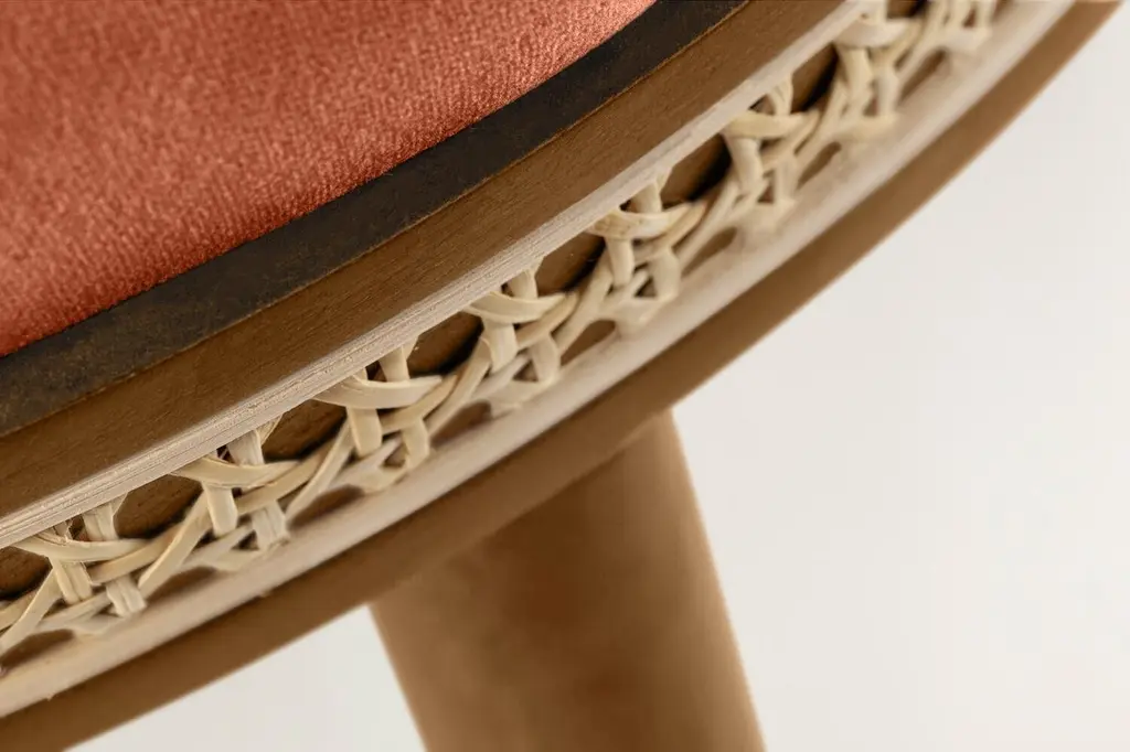 Alma counter & bar stool. As any admirer would experience gazing at its muse, it is impossible not to feel enchanted and almost hypnotized by the refined, sensual lines and the delightfully charming soul of Alma Bar Stool. In a piece that combines classic and modern aesthetics we can find a certain harmonic gracefulness paired with an intimate voluptuousness that can embrace you and surprisingly break the frontiers of sophistication and elegance.MaterialUpholstery: fabric or leatherStructure: solid wood: natural walnut and natural oakRattan: natural rattanFeaturesSeat style: roundSeat back type: sLow backWeight capacity: 400 lb.Footrest included: Yes.