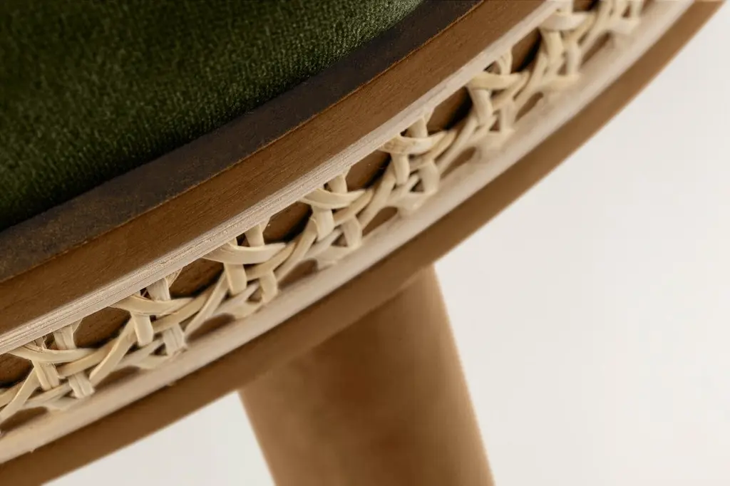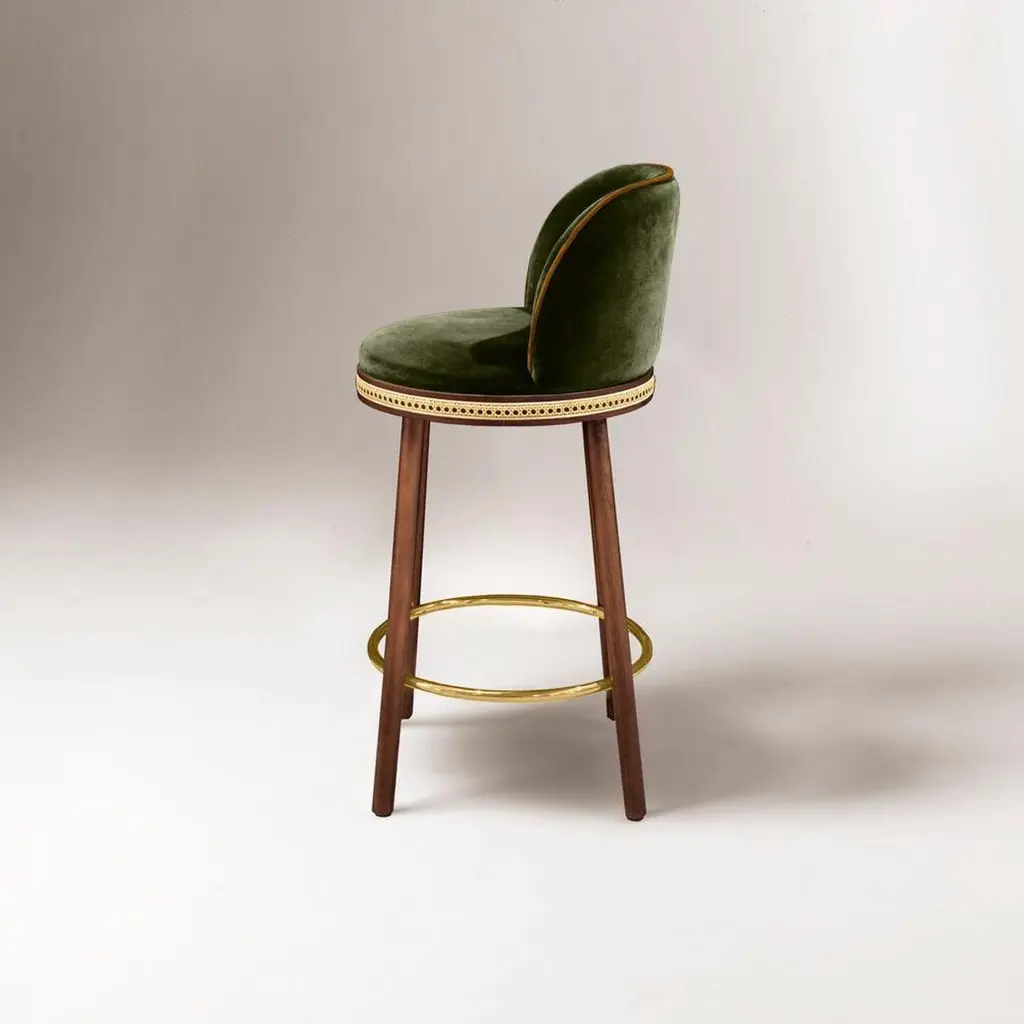Alma counter & bar stool. As any admirer would experience gazing at its muse, it is impossible not to feel enchanted and almost hypnotized by the refined, sensual lines and the delightfully charming soul of Alma Bar Stool. In a piece that combines classic and modern aesthetics we can find a certain harmonic gracefulness paired with an intimate voluptuousness that can embrace you and surprisingly break the frontiers of sophistication and elegance.MaterialUpholstery: fabric or leatherStructure: solid wood: natural walnut and natural oakRattan: natural rattanFeaturesSeat style: roundSeat back type: sLow backWeight capacity: 400 lb.Footrest included: Yes.