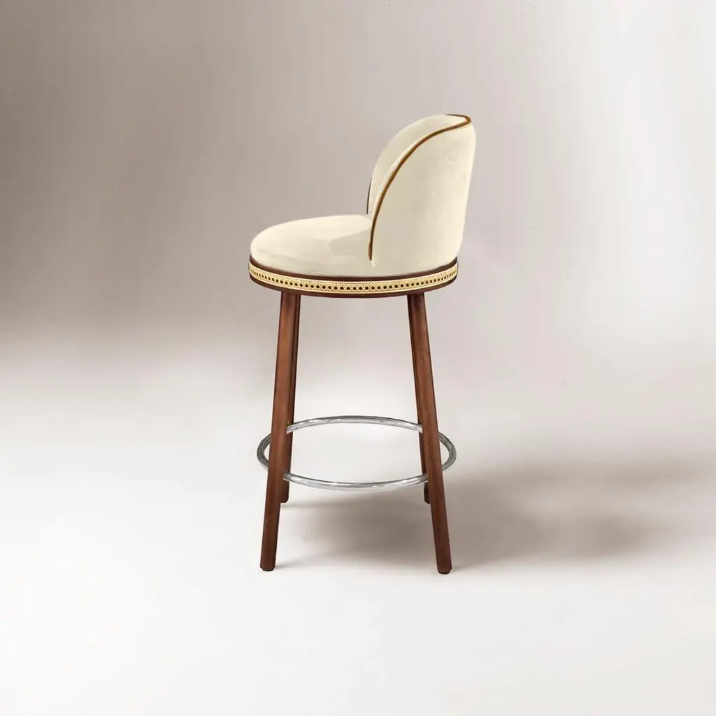 Alma counter & bar stool. As any admirer would experience gazing at its muse, it is impossible not to feel enchanted and almost hypnotized by the refined, sensual lines and the delightfully charming soul of Alma Bar Stool. In a piece that combines classic and modern aesthetics we can find a certain harmonic gracefulness paired with an intimate voluptuousness that can embrace you and surprisingly break the frontiers of sophistication and elegance.MaterialUpholstery: fabric or leatherStructure: solid wood: natural walnut and natural oakRattan: natural rattanFeaturesSeat style: roundSeat back type: sLow backWeight capacity: 400 lb.Footrest included: Yes.