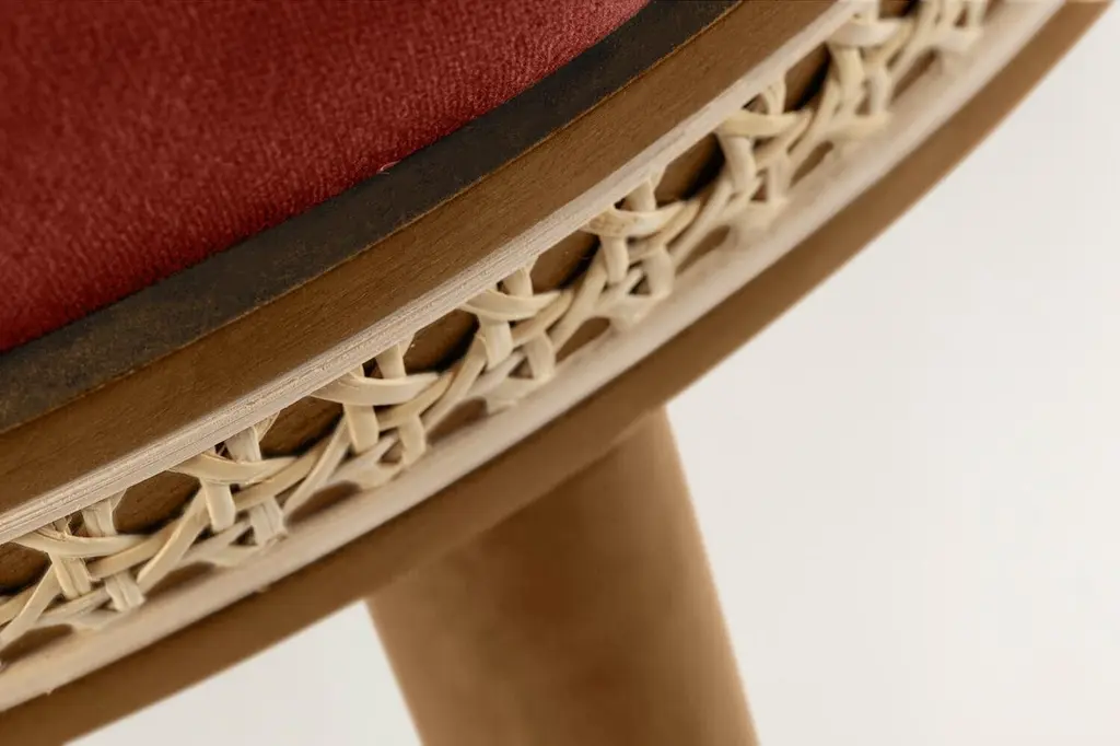 Alma counter & bar stool. As any admirer would experience gazing at its muse, it is impossible not to feel enchanted and almost hypnotized by the refined, sensual lines and the delightfully charming soul of Alma Bar Stool. In a piece that combines classic and modern aesthetics we can find a certain harmonic gracefulness paired with an intimate voluptuousness that can embrace you and surprisingly break the frontiers of sophistication and elegance.MaterialUpholstery: fabric or leatherStructure: solid wood: natural walnut and natural oakRattan: natural rattanFeaturesSeat style: roundSeat back type: sLow backWeight capacity: 400 lb.Footrest included: Yes.