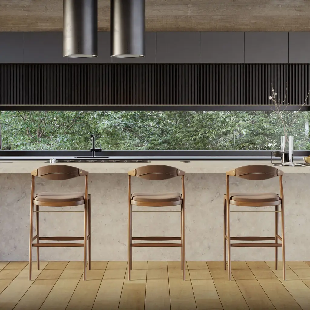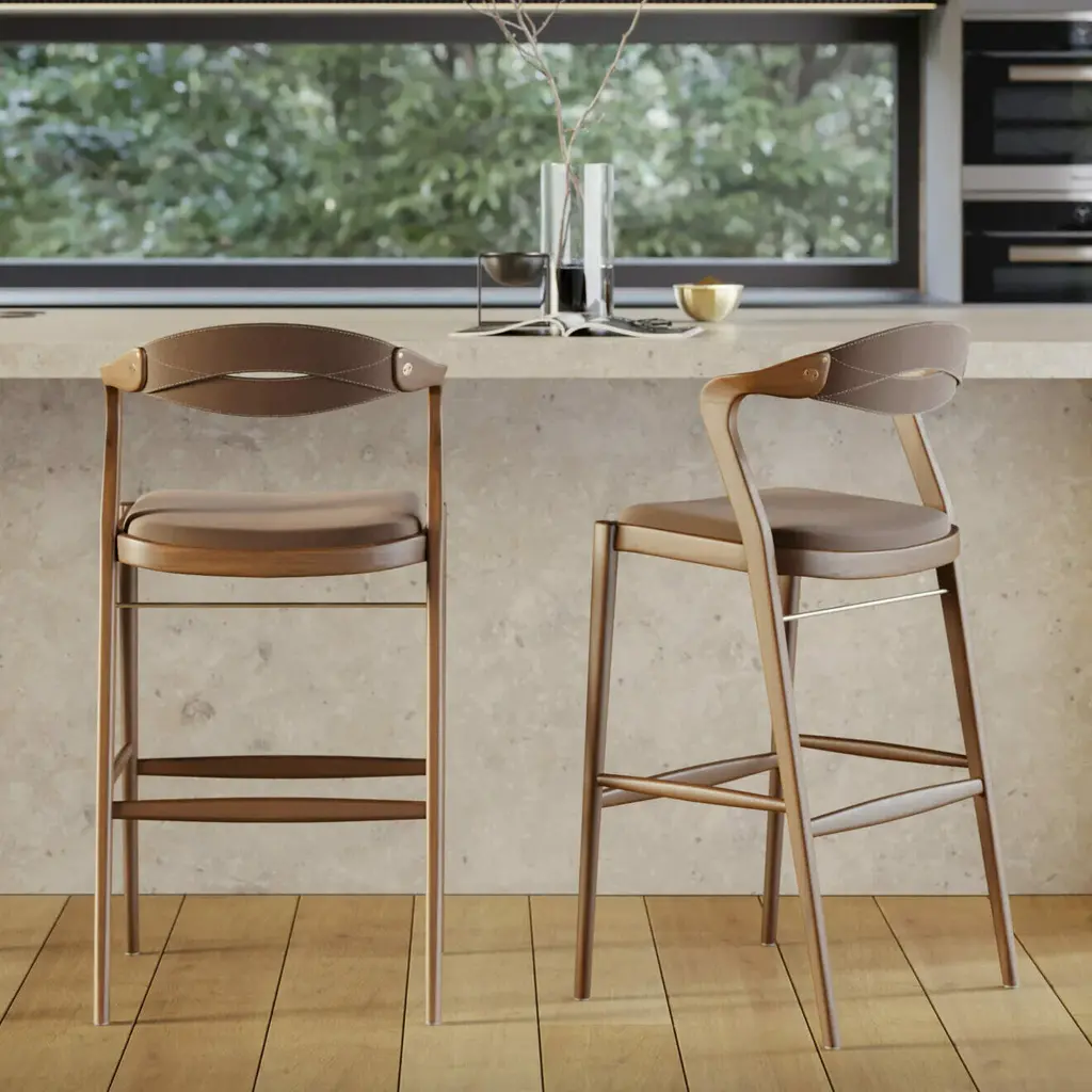 The Angela Barstool from Sossego exudes luxury with its mixed-media design of rich wood, smooth leather, and metallic accents. Its comfortable and stable seat fits all shapes and sizes, allowing for easy swinging in and out. Handcrafted from sustainable Brazilian hardwood, each purchase funds the planting of a tree to replenish resources. Elevate your space with the modern elegance of the Angela Barstool. Highlights