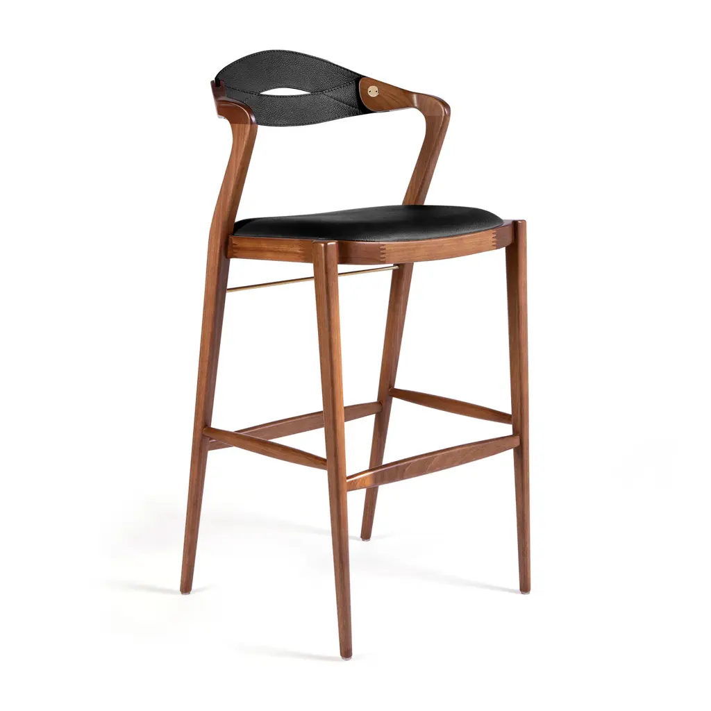 The Angela Barstool from Sossego exudes luxury with its mixed-media design of rich wood, smooth leather, and metallic accents. Its comfortable and stable seat fits all shapes and sizes, allowing for easy swinging in and out. Handcrafted from sustainable Brazilian hardwood, each purchase funds the planting of a tree to replenish resources. Elevate your space with the modern elegance of the Angela Barstool. Highlights