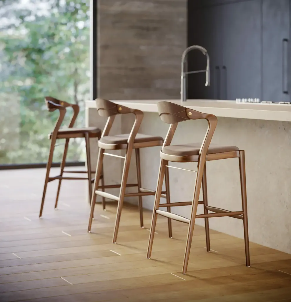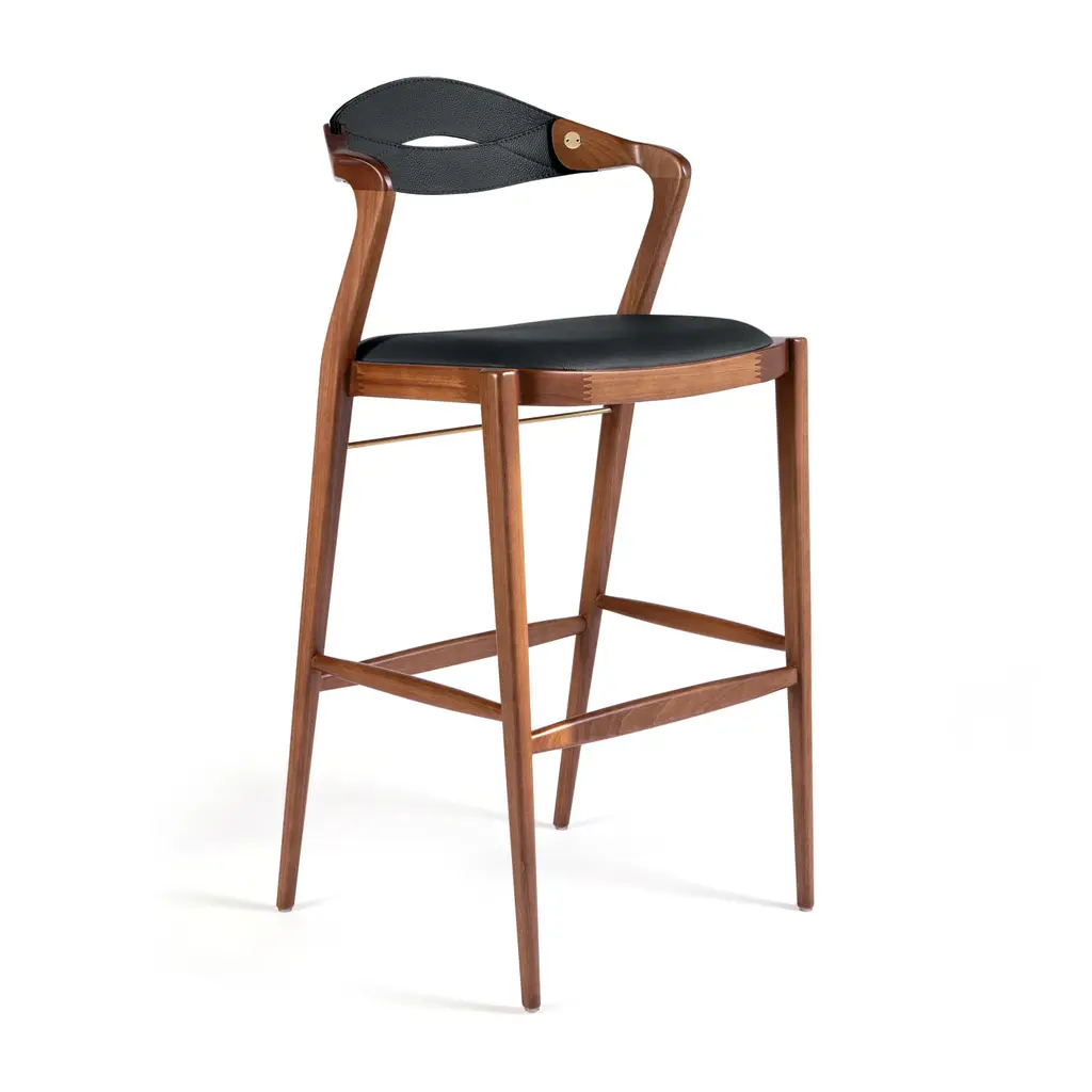 The Angela Barstool from Sossego exudes luxury with its mixed-media design of rich wood, smooth leather, and metallic accents. Its comfortable and stable seat fits all shapes and sizes, allowing for easy swinging in and out. Handcrafted from sustainable Brazilian hardwood, each purchase funds the planting of a tree to replenish resources. Elevate your space with the modern elegance of the Angela Barstool. Highlights