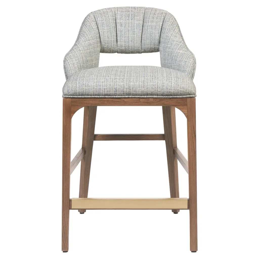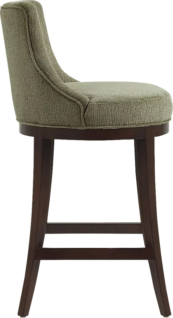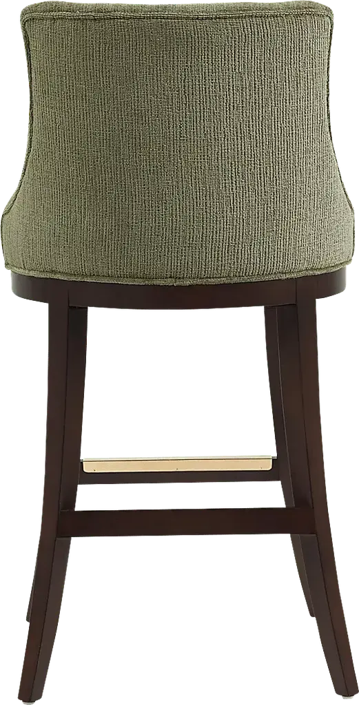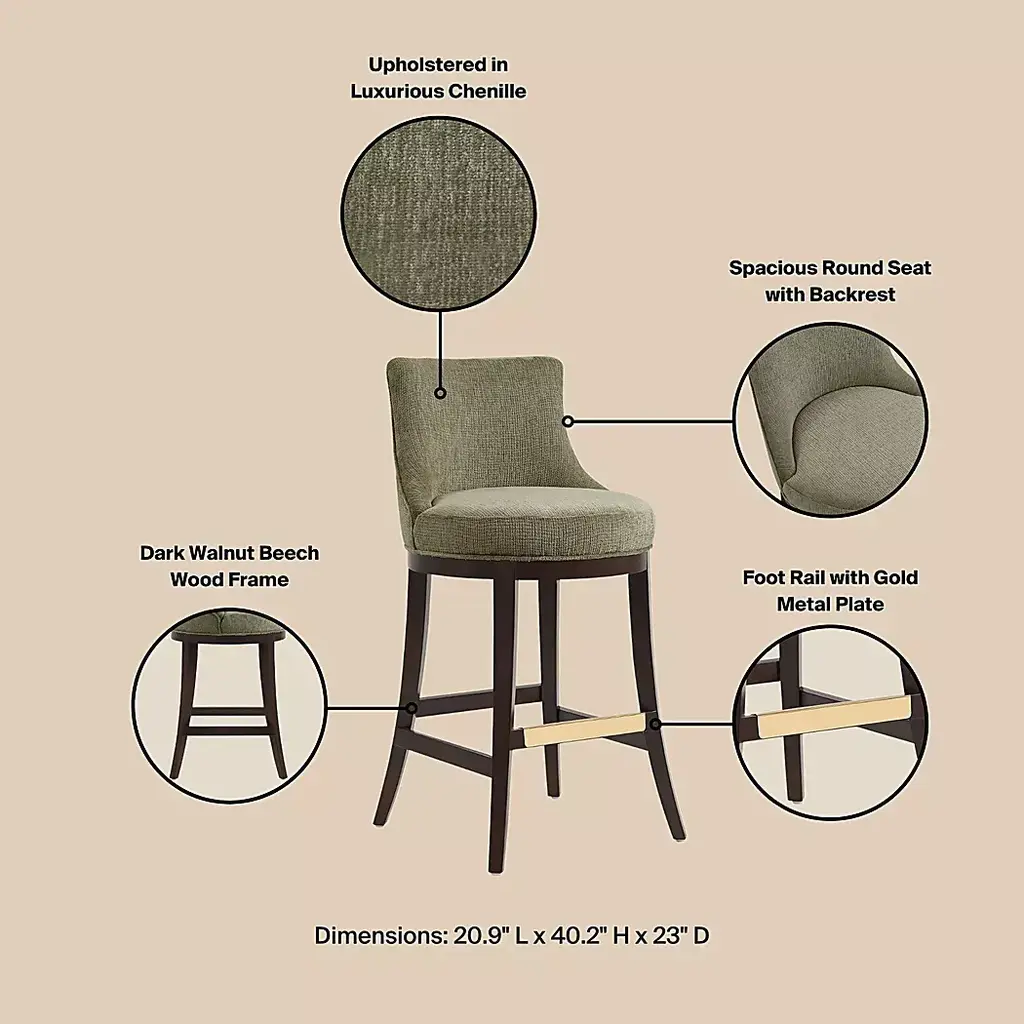 Elevate your everyday seating with the Angelphone green barstool that blends tailored elegance and thoughtful comfort. Wrapped in richly textured chenille, this stool invites you in with a curved backrest, offering both style and support. The generously cushioned seat and the dark walnut wood frame grounds the piece with a timeless warmth. A gleaming gold footrest adds a refined touch, making this stool a perfect companion for your everyday.