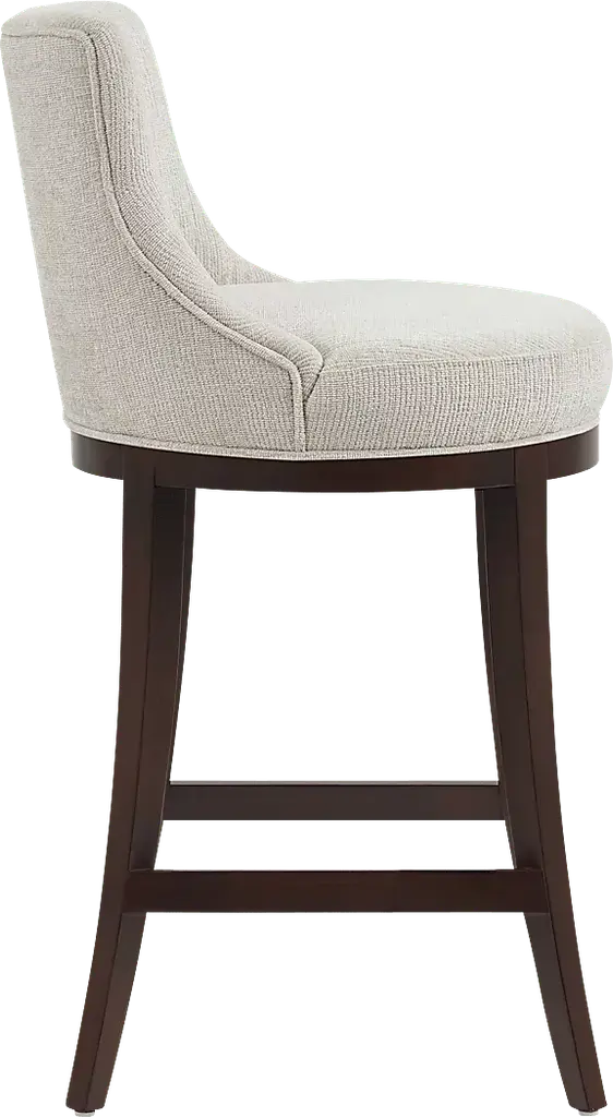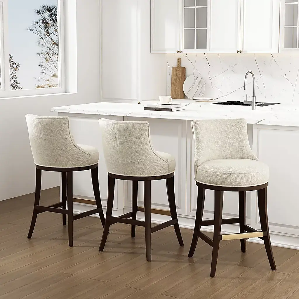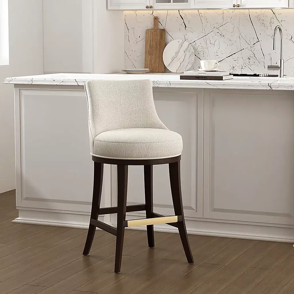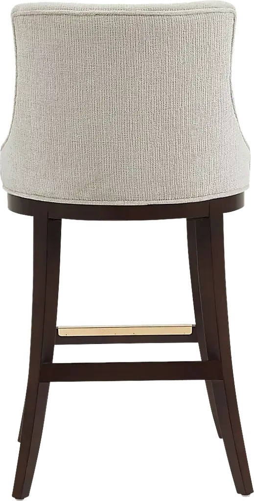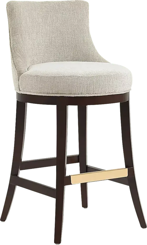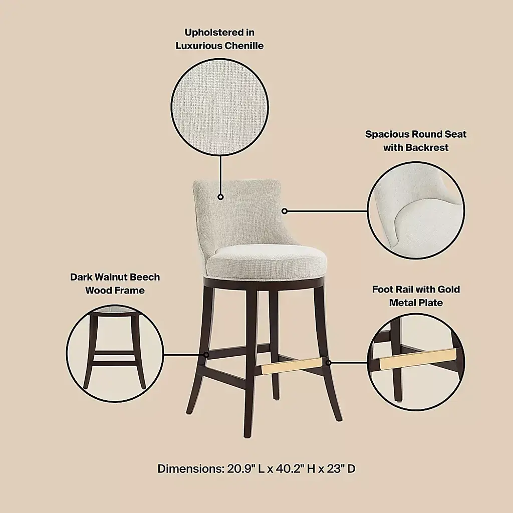 Elevate your everyday seating with the Angelphone natural barstool that blends tailored elegance and thoughtful comfort. Wrapped in richly textured chenille, this stool invites you in with a curved backrest, offering both style and support. The generously cushioned seat and the dark walnut wood frame grounds the piece with a timeless warmth. A gleaming gold footrest adds a refined touch, making this stool a perfect companion for your everyday.