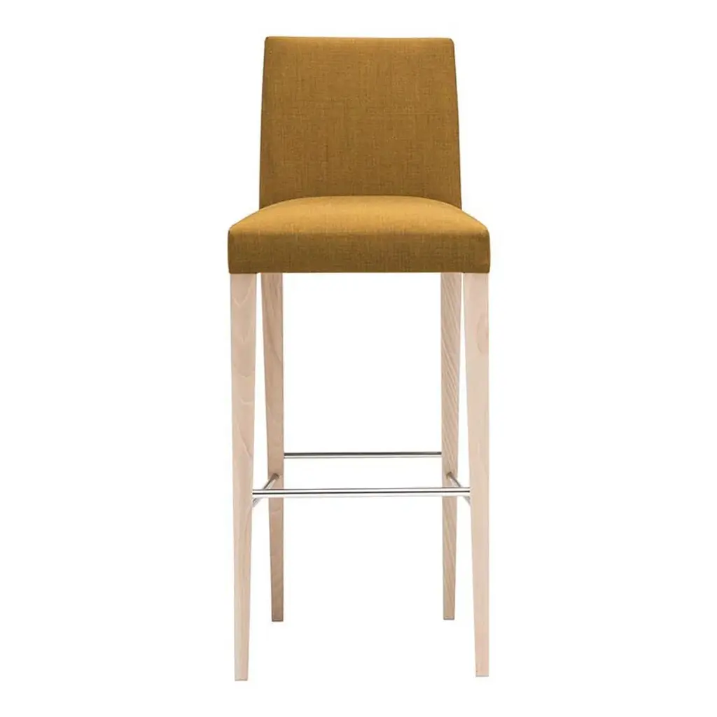 Barstool with upholstered seat and backrest. Solid beech wood frame.The Anna family of seating, including Lounge, Easy Chair, Corporate and Luxe lines, share a same aesthetic language. Anna is an elegant option for lounge chairs, easy chairs and sofas made in solid beech wood and with eye catching upholstery. The design is offered in two different back heights.