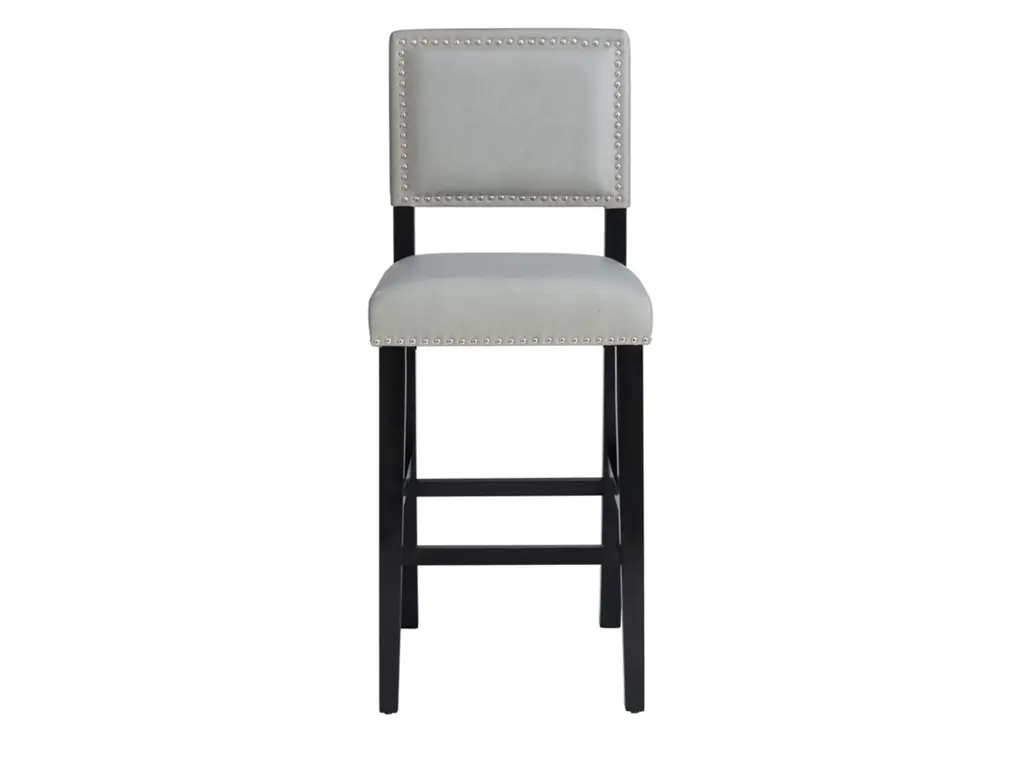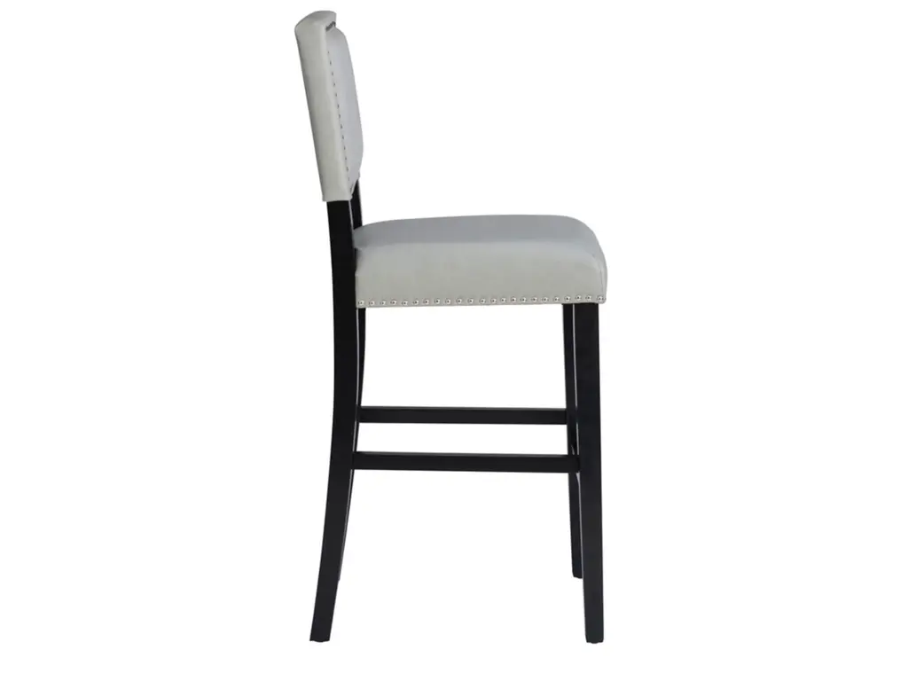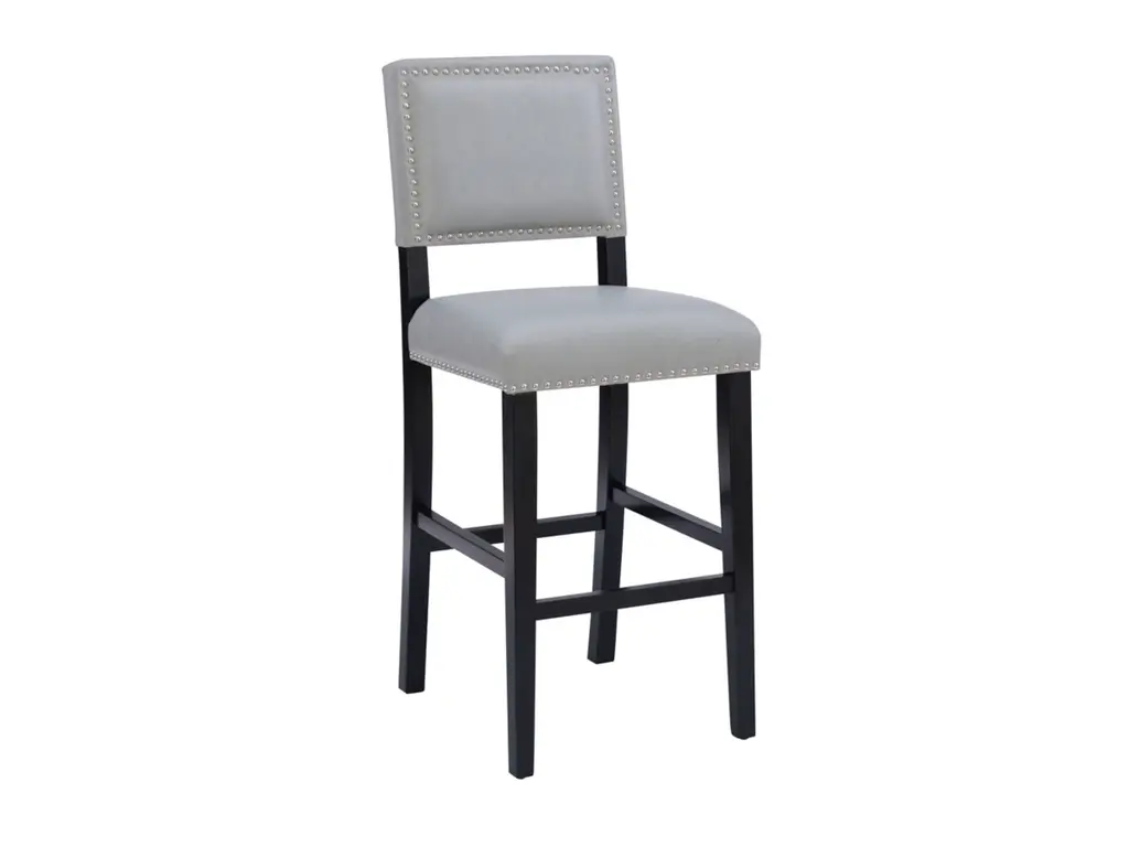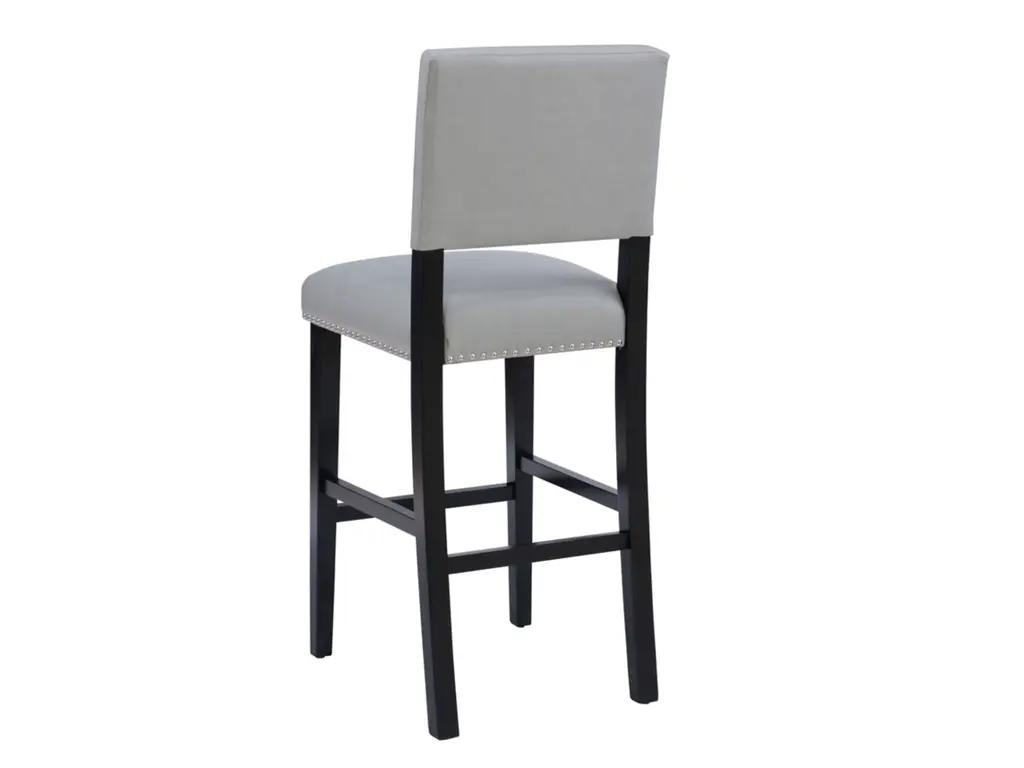 Add color and seating to your kitchen or dining space with the Arden stool. Crafted from sturdy hardwood, the stool features bottom footrails for added stability and durability. The black finish is accented by a dove gray upholstered seat and back. Shiny silver nailheads add extra interest. Bar height.