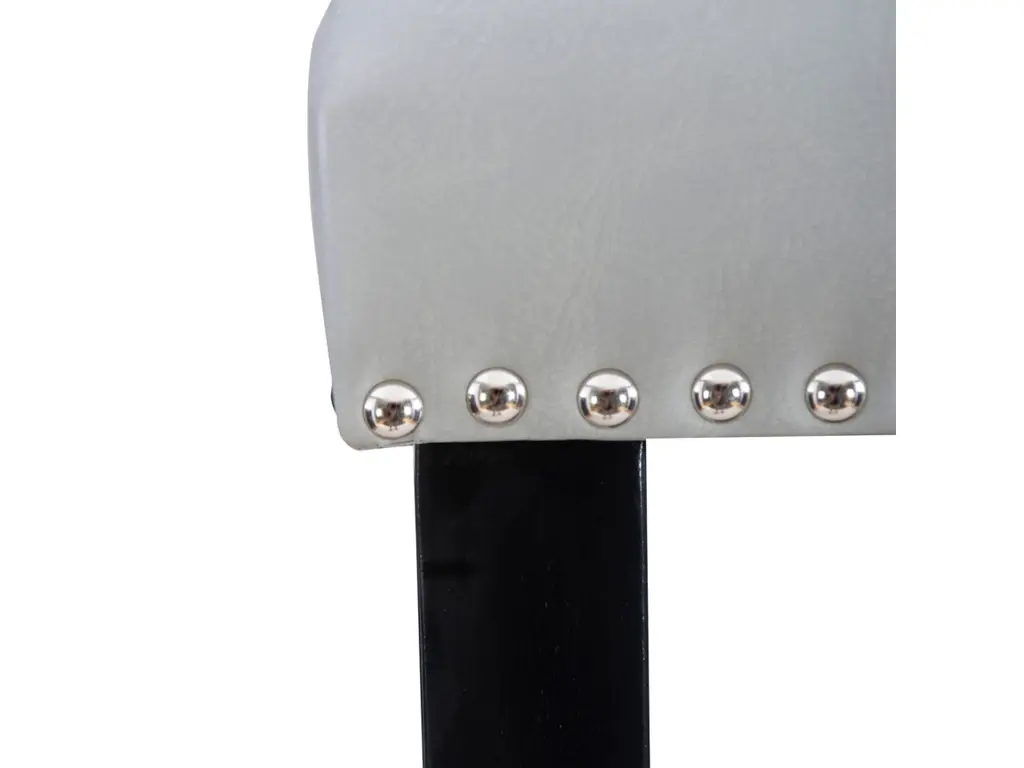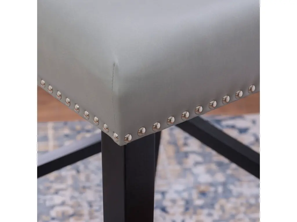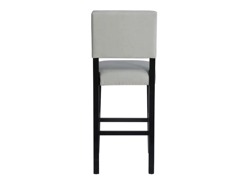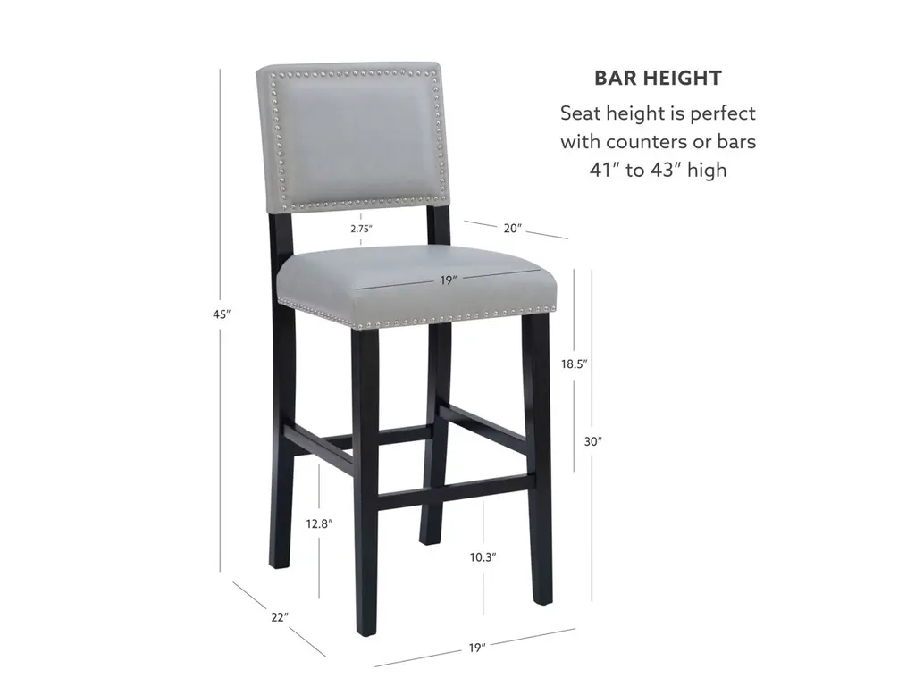 Add color and seating to your kitchen or dining space with the Arden stool. Crafted from sturdy hardwood, the stool features bottom footrails for added stability and durability. The black finish is accented by a dove gray upholstered seat and back. Shiny silver nailheads add extra interest. Bar height.
