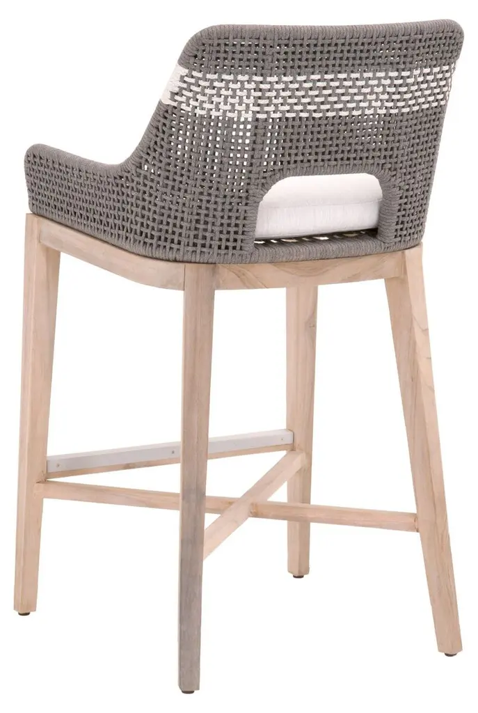 Framed in aluminum and teak—a moisture-resistant hardwood that is also resistant to warping, swelling, and shrinking—with intricately woven rope details, this textural barstool is sure to stand out on the porch or patio. An all-weather cushion filled with foam ensures a comfortable seat.