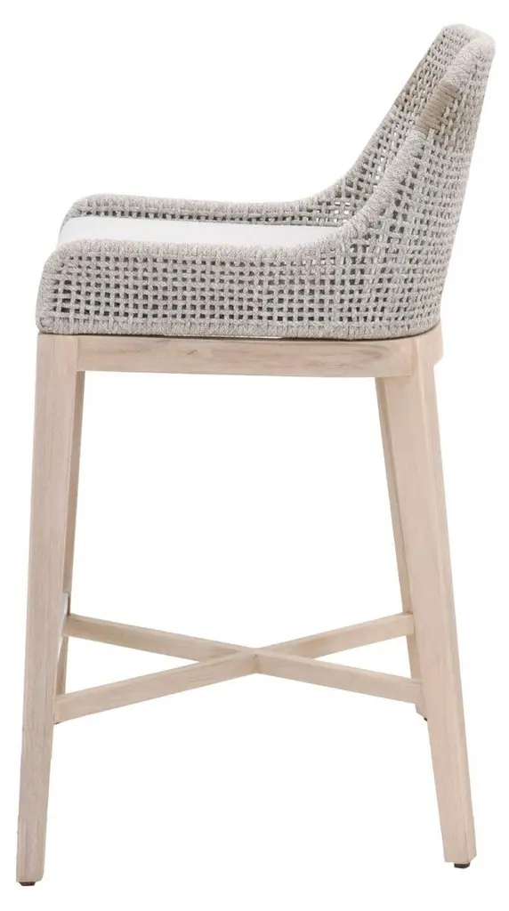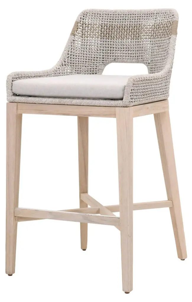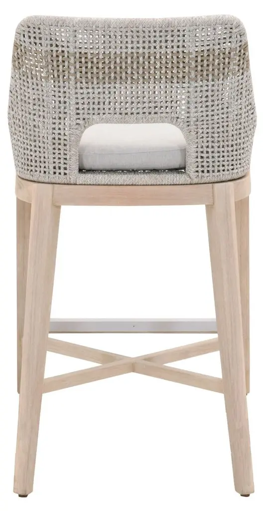 Framed in aluminum and teak—a moisture-resistant hardwood that is also resistant to warping, swelling, and shrinking—with intricately woven rope details, this textural barstool is sure to stand out on the porch or patio. An all-weather cushion filled with foam ensures a comfortable seat.