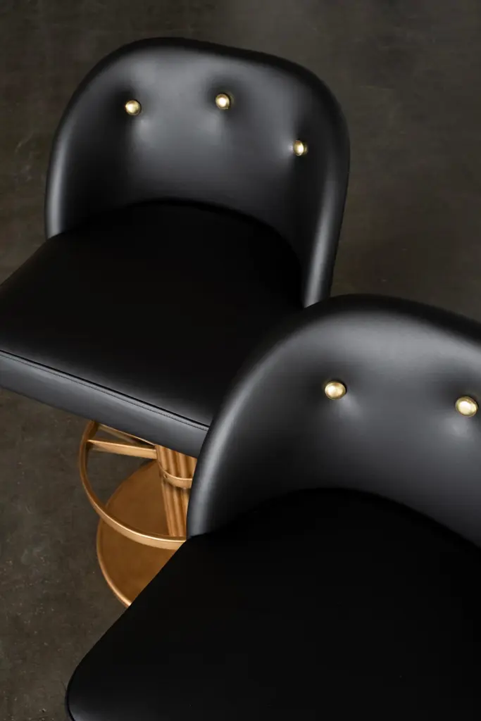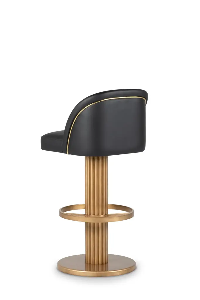 Art Deco Flute bar stool, Handcrafted in Portugal - Europe by Greenapple.The Flute bar stool is a symphony of form and reflection, bringing rhythm to contemporary interiors. Inspired by the essence of music, its sculptural silhouette plays with depth and perspective, creating a striking visual composition. With an Art Deco influence, the Flute bar stool transforms any space into an elegant stage where design and symmetry come together in perfect harmony.The Flute bar stool is upholstered in black leather, with piping and buttons in golden leather. Metal base lacquered in antique gold with patina effect and satin varnish.The Flute bar stool can be customized in terms of dimensions, materials and finishes.Art Deco Flute bar stool Material CodesFI126 Lacquered, Patinated, Varnished, Antique Gold, SatinM103886 Leather, BlackM101820 Leather , GoldHandcrafted in Portugal - Europe by GreenappleUnique by design, Crafted by peopleGreenapple transforms contemporary spaces into exclusive narratives of design and craftsmanship. From custom-made furniture to bespoke interiors, each creation is a timeless work of art, shaped by master artisans who honor centuries-old techniques.Founded in 2005 by Sérgio Rebola and Rute Martins, Greenapple has earned global recognition among high-end clientele and leading design firms. While Rute designs each unique piece, Sérgio ensures uncompromising quality from design to production and from production to your home. We provide a seamless experience, offering short production lead times, worldwide delivery within 7 to 10 days, and white-glove service upon request.For U.S. clients, we can handle customs clearance, and offer white-glove service as well upon request.Counter Stool, High Stool, Bar Seat