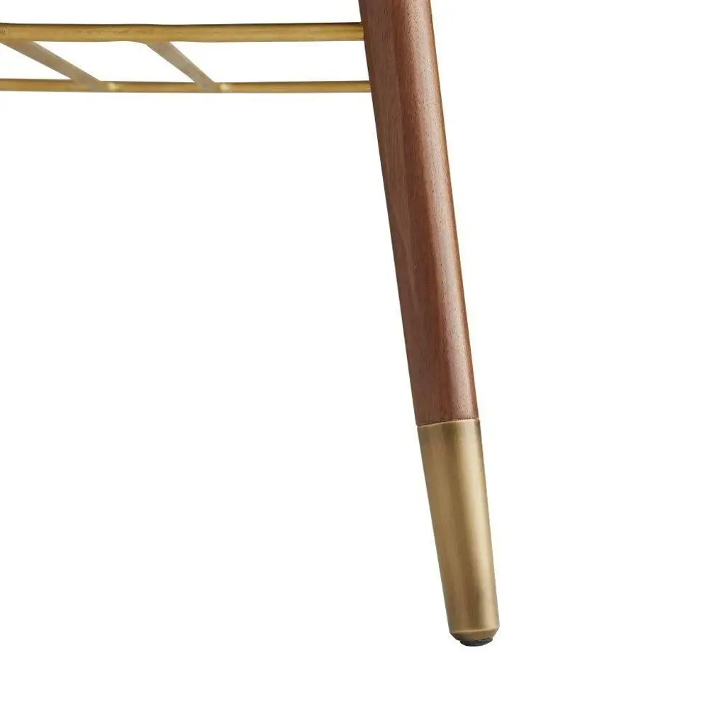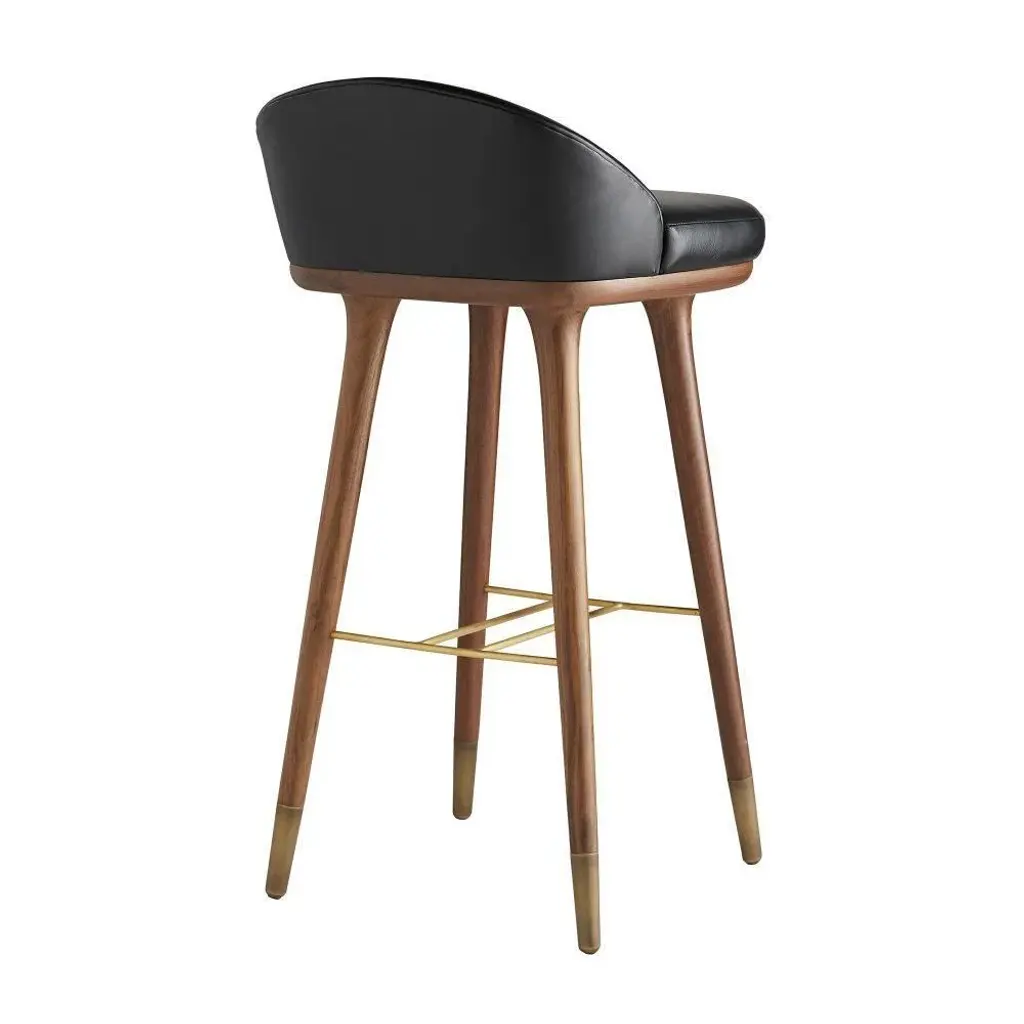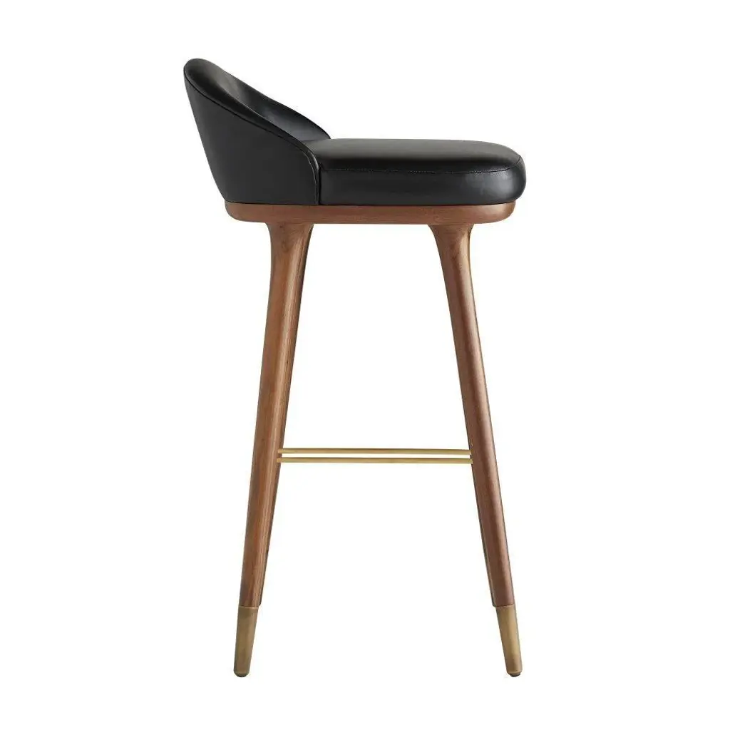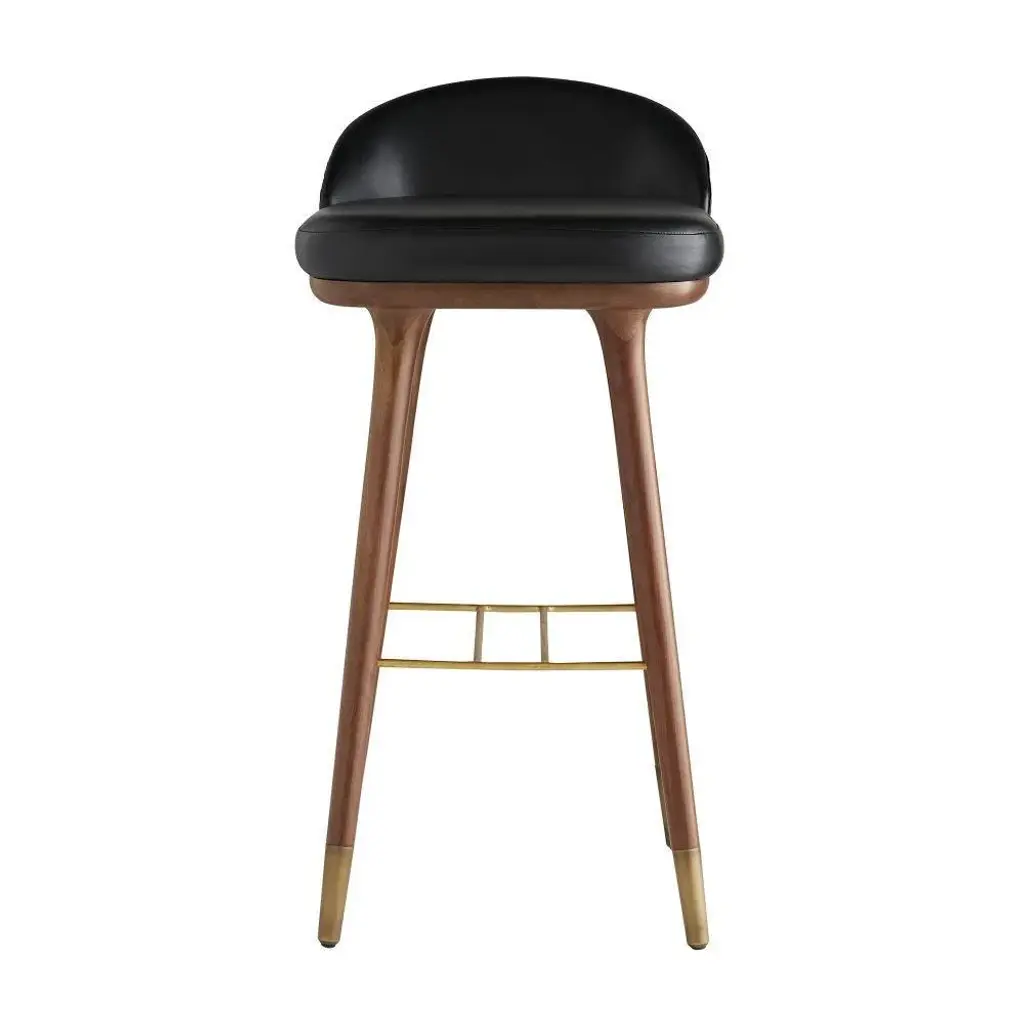 Form meets function as modern meets traditional with this bar stool. The black leather seat lends a contemporary touch to the traditional style of the solid walnut-finish wood legs, while an antique brass stretcher adds support and acts as an accent to the dark façade. Featuring a low back and no arms, the minimalist profile of this piece makes it ideal for tucking under a counter. Finish and leather may vary.