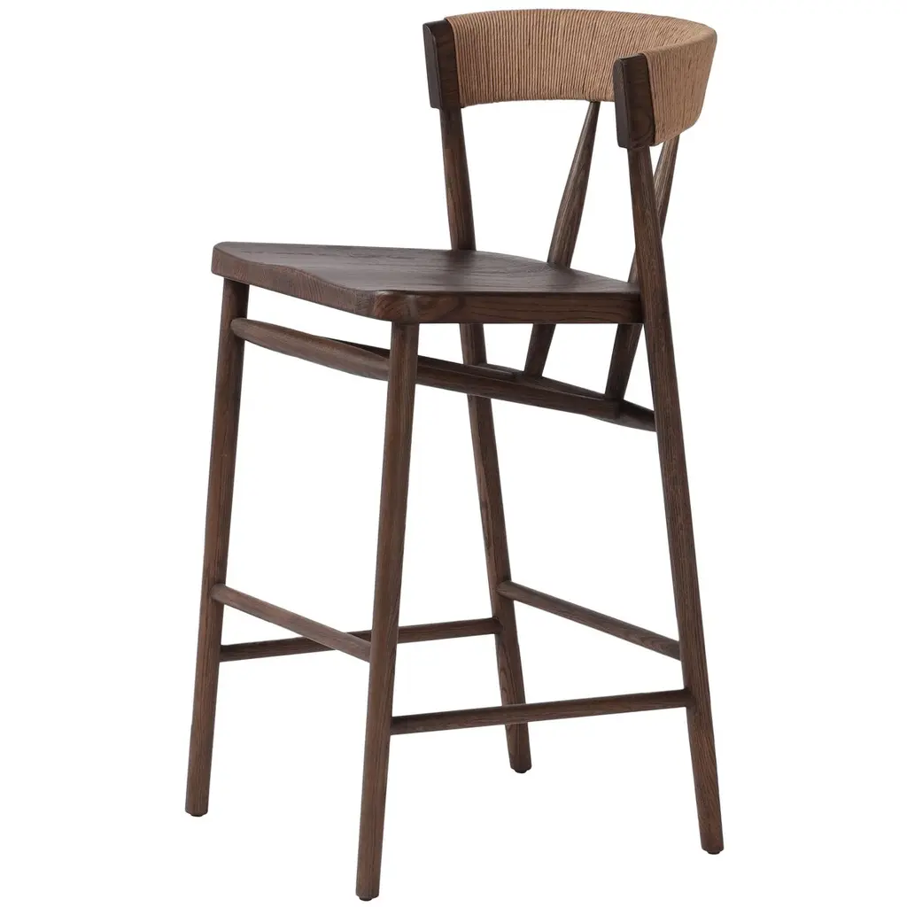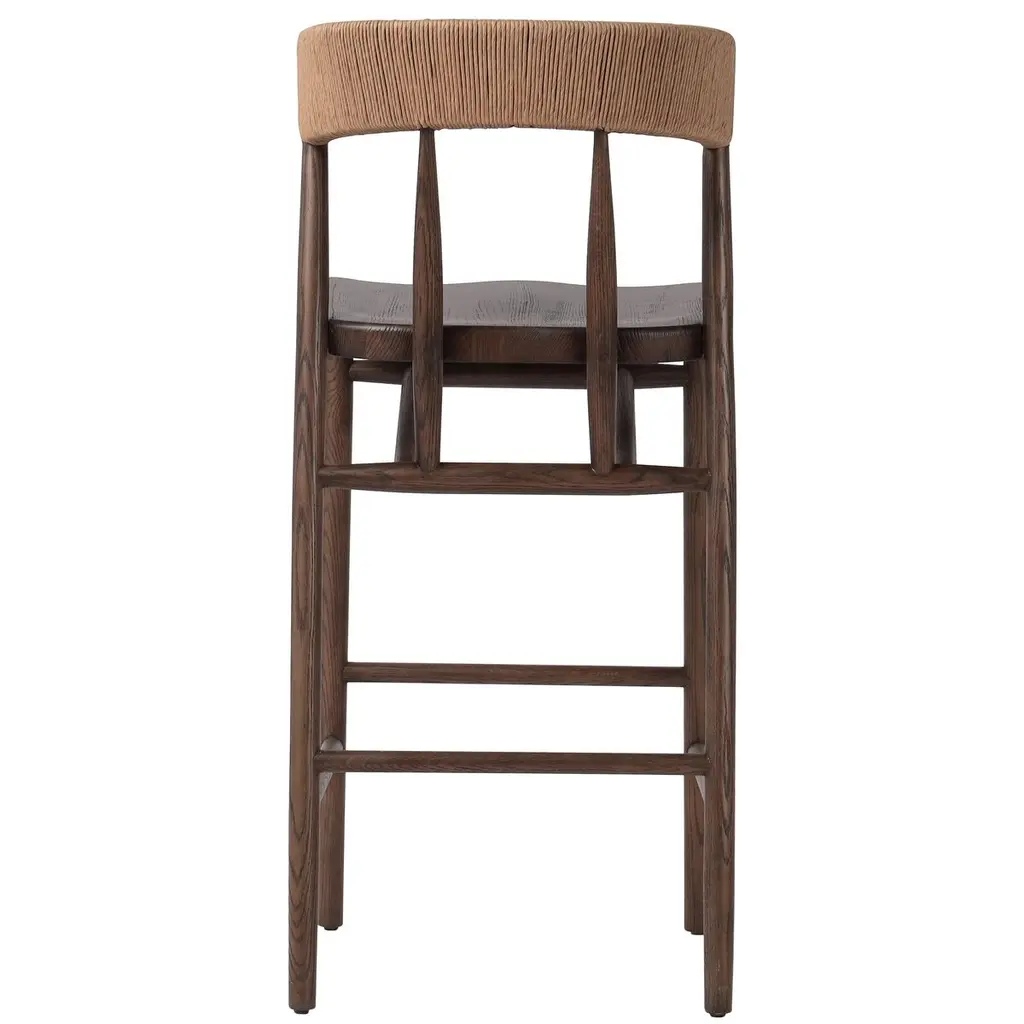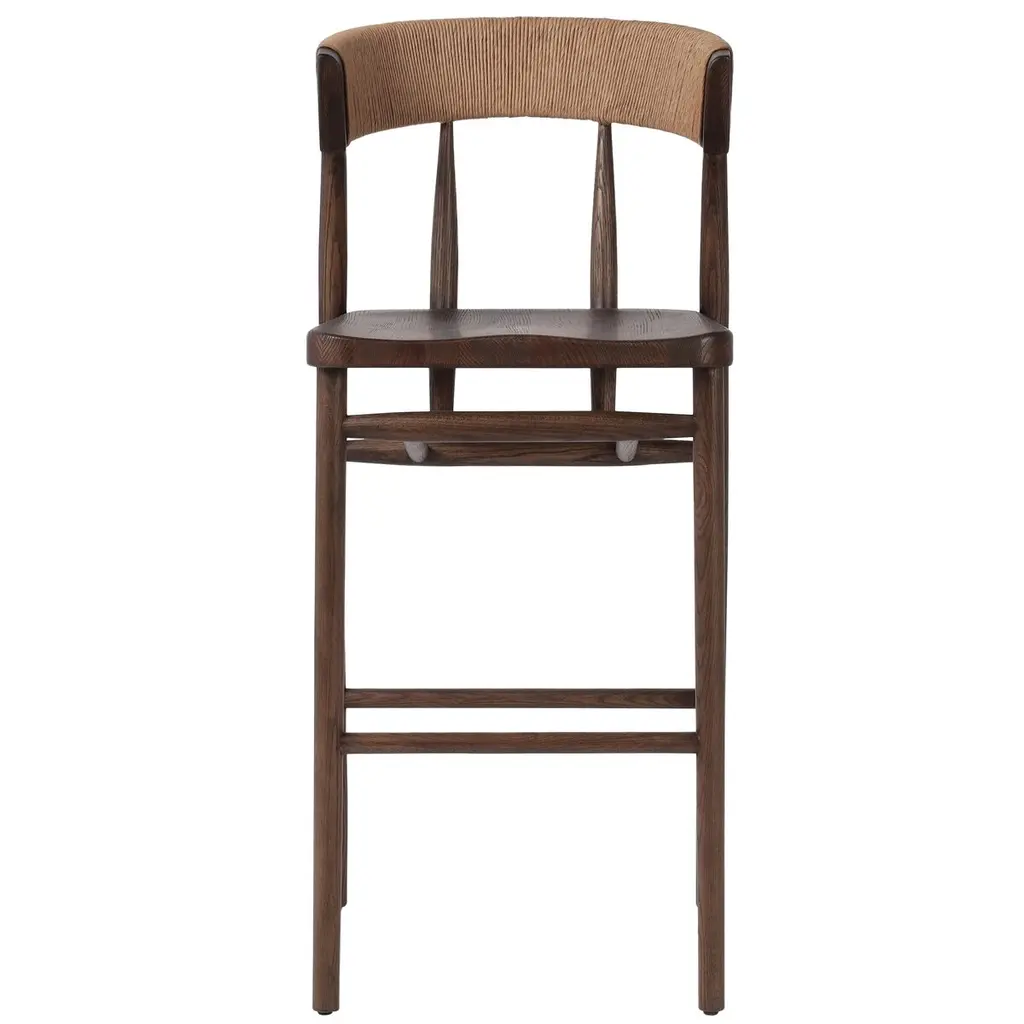Paper rush wrapped around the top of the seat back brings a textural complement to this barstool's durable oak frame. A contemporary tribute to the classic Windsor chair, the stool has a gently curved seat for added comfort.