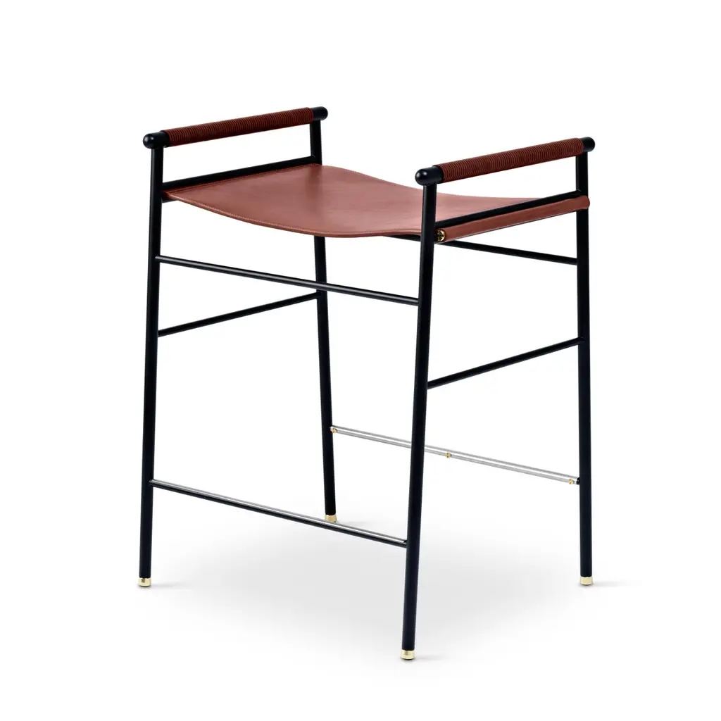 The “Repose” contemporary counter stool belongs to a collection that revisit the director chair collection, serene pieces where exclusivity and precision are shown in small details such as the hand-turned metal nuts and bolts that fix the leather surfaces, that go unnoticed at first sight.The robustness of the steel structure is combined with the delicacy of the rounded structure. The matte metal finishes evoke the passage of time and are complemented by vegetable tanned cowhide leathers that age gracefully with its use.The “Repose” collection is designed and conceived as a tribute to director’s chair or luxury safari foldable furniture. All pieces are done with cold steel rods, machined on a turning lathe, black powder coated and lacquered with a matt rubber effect. Our signature screws are made with brass turning lathed, polished, and lacquered, these are the pieces that fix the saddle leather to the metal frame.Leathers are Spanish hides vegetable tanned. We use premium saddles in five colors to adjust to your taste and interior needs. This traditional vegetable dyeing and tanning method is an organic technique that relies on natural tannings from bark or plant tissues. The use of oils and natural fats give the leather a distinctive flexibility and texture, allowing it to be molded, retain its shape and age graciously.All skins are carefully selected from food industry sub-products, with a minimum thickness of 3.5 mm / 0,02 in, using the part of the animal's shoulder, which allows for larger pieces and uniformity, even though signature wrinkle from the animal’s neck may be recognizable. The vegetable tanning is a traditional and artisan treatment, which is respectful to the environment. Even with careful selection natural marks as a result of the contact with other animals, the age, origin and characteristics of the skin, or even the season in which the tanning takes place cannot be avoided. We still believe that these factors only add authenticity and uniqueness to every piece. Our leather parts are made with double saddles, always showing the top side of the hides that presents the better quality.Customization options.With the aim of creating customized pieces, clients can select from the various leather colors to create pieces that complement their home décor. Leather colors available, black, navy, dark brown, cognac and natural tobacco, and steel color is black.Normally we use off white threats for stitches, but client can select another option, being possible to select any color to make a unique piece for the project it belongs. The finish on the edges of our leather components is sanded and hand painted. We have the option to select an alternative color if not tone on tone will be applied.Please consult in case you are interested on having a particular heat embossing stamp on the leather.Our high-end collections are made to full fill home spaces where to gather and enjoy great conversation with families and friends. Occasional one-of-a-kind furniture for exquisite homes, from cottages to exclusive resorts. Our product is understood as a sculptural piece of design, as an art object to be displayed at different house spaces as library, bar, living, foyer, bedroom, powder, meeting, grand or great room.The different finishes options make the furniture perfect combinations on diverse styles, from rustic mountain home, a small cottage, a ski lodge retreat, or industrial a minimalist look. The 'Repose' contemporary armchair is a part of our exclusive collection that reimagines the classic director chair with a serene and exquisite design. Every detail is carefully crafted, from the hand-turned metal nuts and bolts that secure the leather surfaces, to the robust yet delicate combination of steel and rounded structure. The matte metal finishes evoke a timeless appeal, complemented by vegetable-tanned cowhide leathers that age gracefully over time.Designed as a tribute to director's chairs and luxury safari foldable furniture, the 'Repose' armchair is meticulously constructed using cold steel rods, machined on a turning lathe, and finished with a black powder coating and a matt rubber effect. Our signature brass screws not only add elegance but also securely fix the saddle leather to the metal frame.We use premium Spanish hides that undergo vegetable tanning, a traditional and environmentally-friendly technique relying on natural tannings from bark or plant tissues. The use of oils and natural fats gives the leather a distinctive flexibility, texture, and longevity, allowing it to mold, retain its shape, and age gracefully. Each skin is carefully selected from food industry sub-products, ensuring a minimum thickness of 3.5 mm / 0.02 in. While some natural marks and wrinkles from the animal's neck may be noticeable, we believe they enhance the authenticity and uniqueness of every piece.Our leather parts are made with double saddles, always showcasing the top side of the hides for superior quality. We offer customization options to suit individual preferences and home décor, with a range of leather colors including black, navy, dark brown, cognac, and natural tobacco. The steel color is black, seamlessly blending with various interior styles.For stitching, we typically use off-white threads, but clients have the flexibility to select alternative colors, making each piece truly unique. The edges of our leather components are meticulously sanded and hand-painted, providing a refined finish. Additionally, we offer the option to choose an alternative color for a striking contrast if a tone-on-tone effect is not preferred.If you desire a personal touch, we offer the possibility of incorporating a particular heat embossing stamp on the leather. Our high-end collections are designed to create a gathering space for families and friends, offering one-of-a-kind furniture for exquisite homes, ranging from cottages to exclusive resorts. Each piece is a sculptural work of art, perfect for 