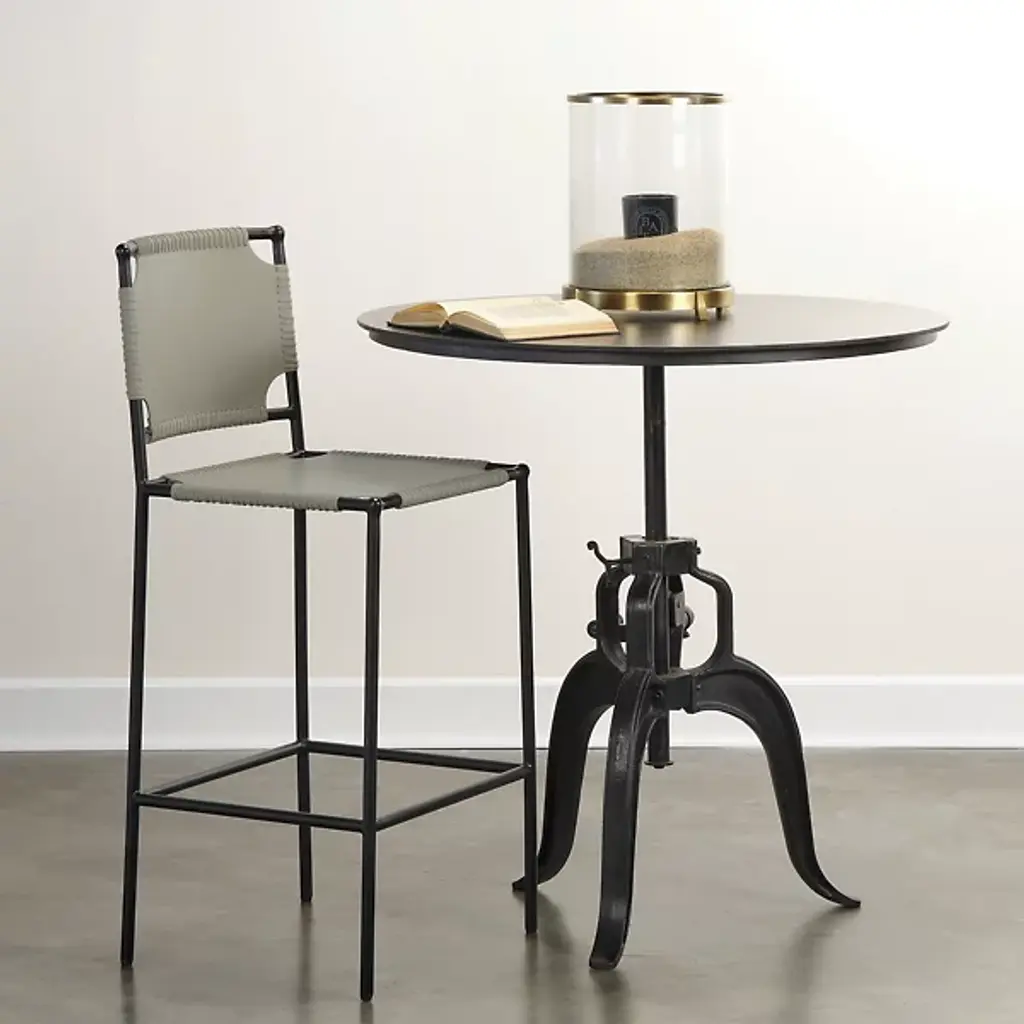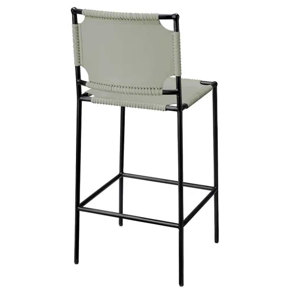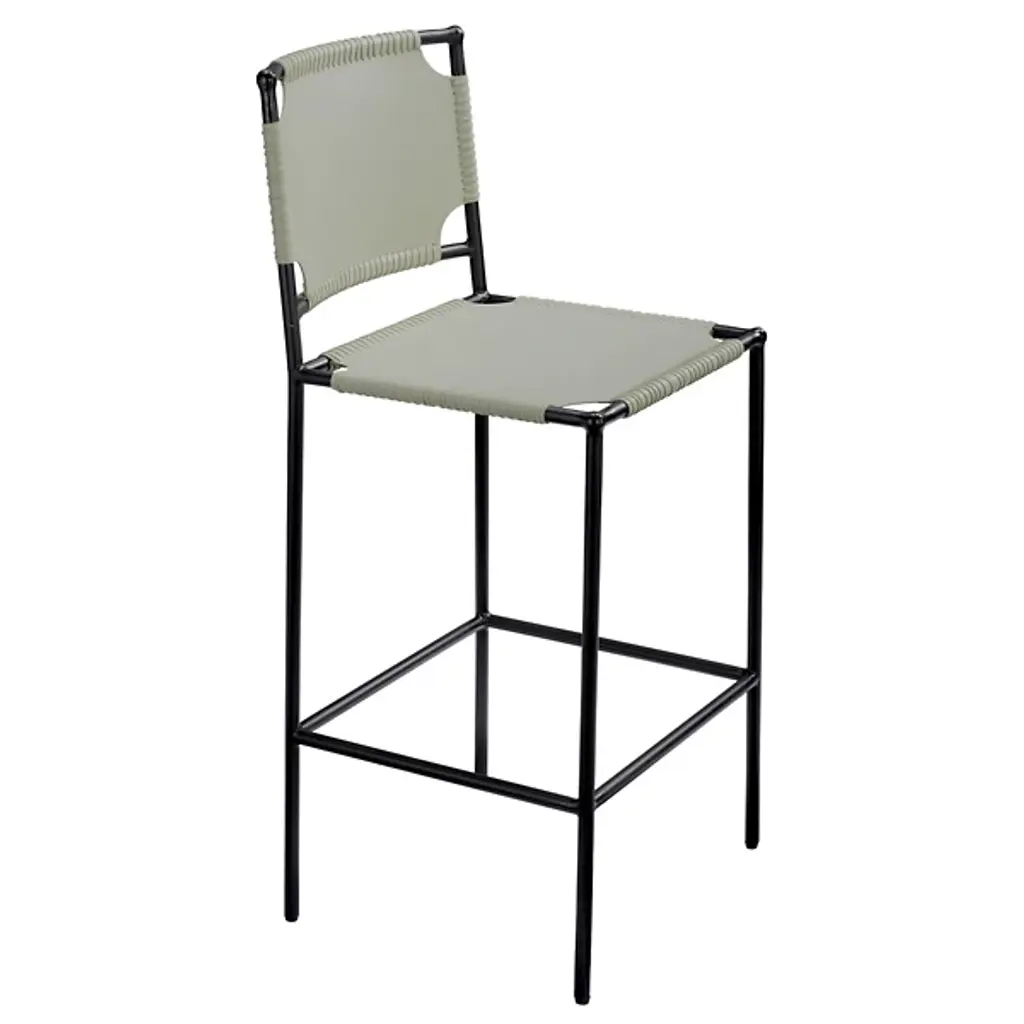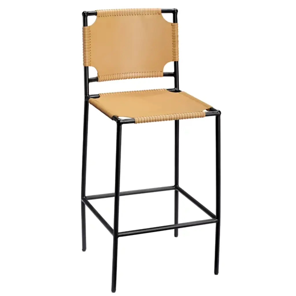 The Asher Bar Stool from Jamie Young CO. sits tall with an easy-going, sling-style design. It makes a bold first impression through its graphic steel framework. The linear framework provides a comfortable footrest and a supportive backrest. Artisans apply sling-style leather to the back and seat rest for low-profile relaxation. This leather features a smooth texture that’s elegant and familiar. Stitched accents outline the leather, underscoring the piece’s attention to detail and crafted character.
