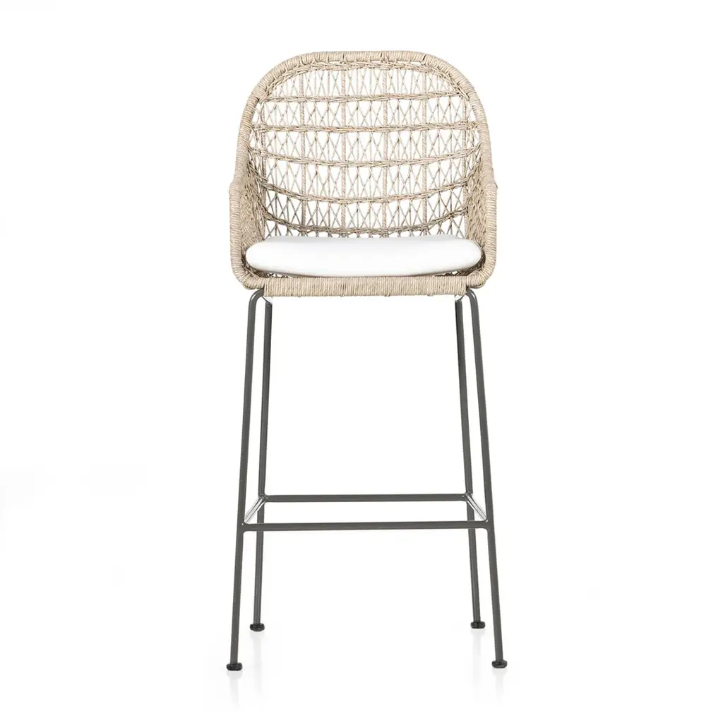 Clean, contemporary shaping and an updated weave transform all-weather wicker into something modern. This high-texture bar stool is supported by a contrasting bronzed iron base, with a white seat cushion for comfort. Cover or store indoors during inclement weather and when not in use. In Stock Mid December All-weather cushion All-weather woven wicker seat Bronze iron frame This image is for illustrative purposes only. The colors shown are accurate within the constraints of lighting, photography, and the color accuracy of your screen.
