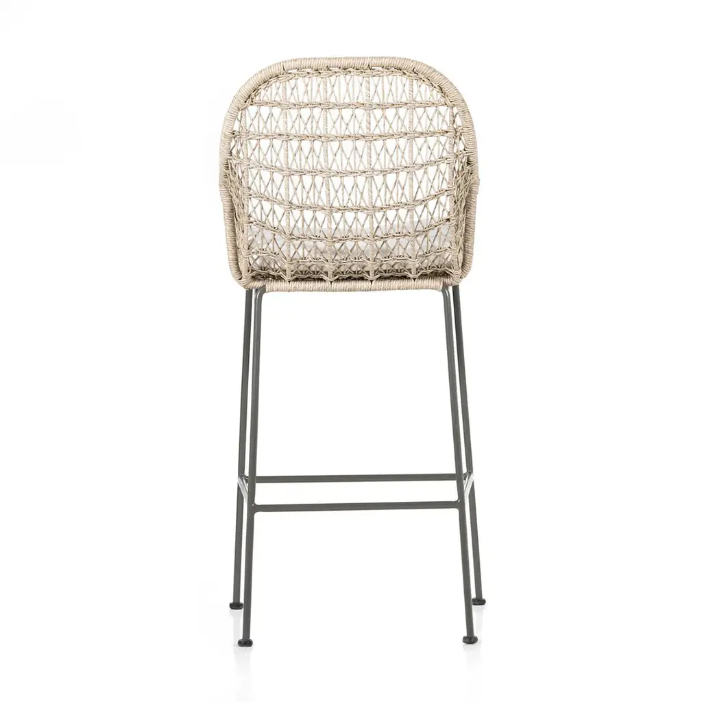 Clean, contemporary shaping and an updated weave transform all-weather wicker into something modern. This high-texture bar stool is supported by a contrasting bronzed iron base, with a white seat cushion for comfort. Cover or store indoors during inclement weather and when not in use. In Stock Mid December All-weather cushion All-weather woven wicker seat Bronze iron frame This image is for illustrative purposes only. The colors shown are accurate within the constraints of lighting, photography, and the color accuracy of your screen.