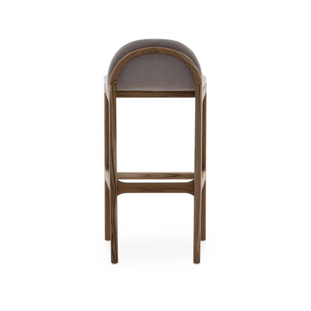 The Ura bar stool blends thoughtful design with natural elegance, offering a refined seating option for kitchen islands, breakfast bars, or commercial hospitality spaces. Crafted in Brazil by the Uultis Studio team, this bar-height stool features a sculptural solid teak base, whose rich grain and subtle variations are enhanced by a velvety matte finish that preserves the authentic texture of the wood. The seat is upholstered in Wheat Thin Twill Weave, a light gray fabric that softens the stool’s lines while providing comfort and visual contrast. The minimalist frame, softened by gently rounded corners and tapered legs, feels both modern and organic—making the Ura stool an easy companion to contemporary interiors with natural or neutral palettes. A built-in footrest and supportive back offer added ergonomics for longer sitting sessions, whether at home or in a commercial setting.Fully assembled upon arrival, the Ura stool requires no setup, allowing for seamless integration into your space. It brings together sustainable materials, Brazilian craftsmanship, and clean design—delivering both durability and understated style in one piece. Please check availability prior to purchase.