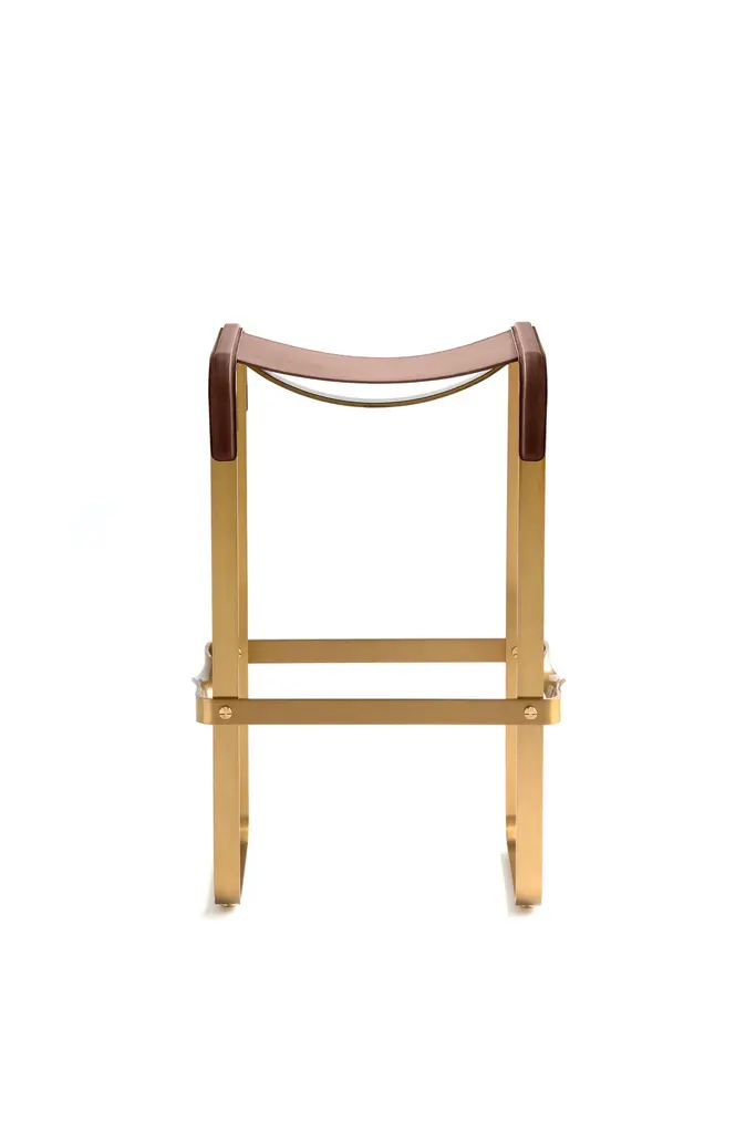 Bar Stool Aged Brass Steel And Dark Brown Saddle Leather, Contemporary Style