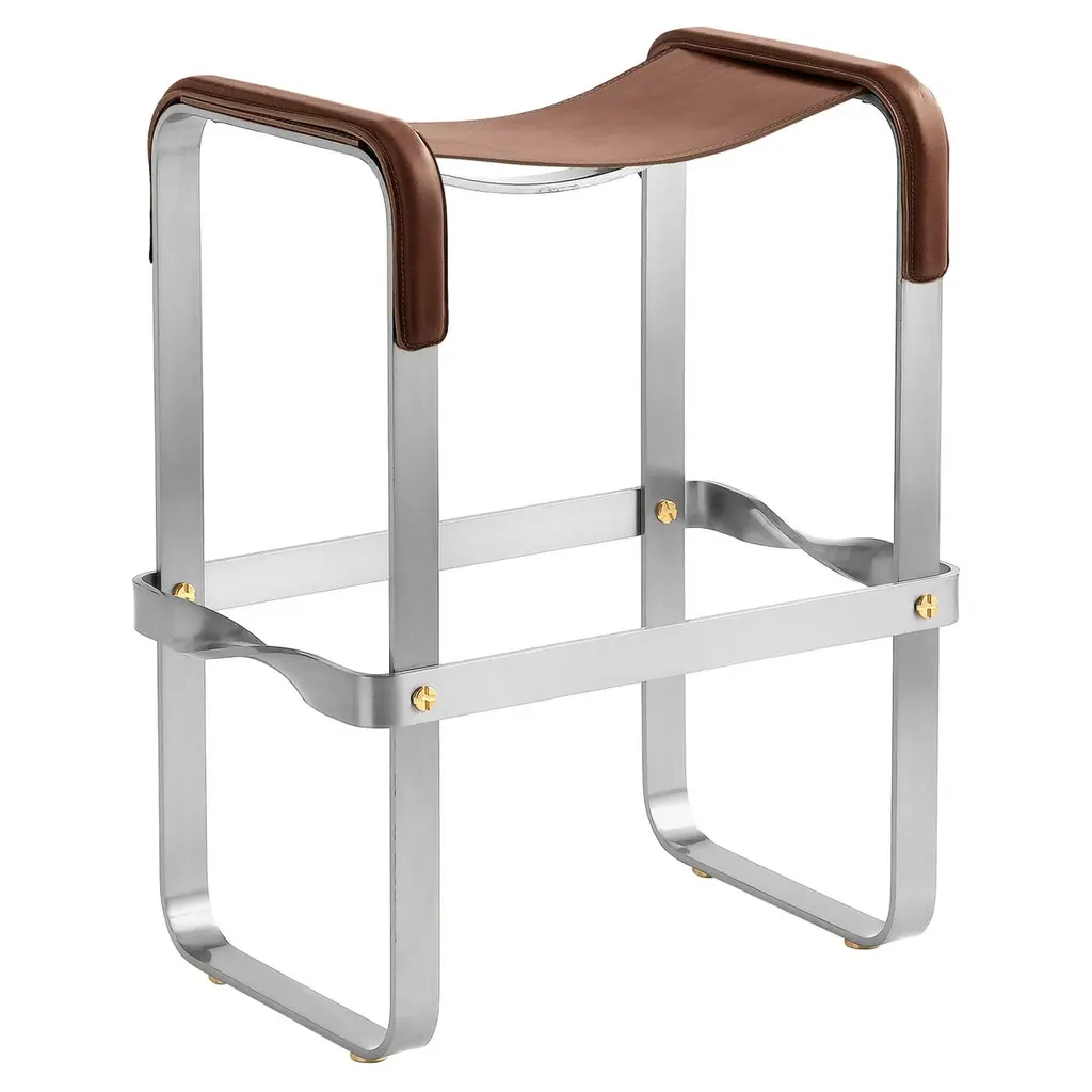 The Wanderlust contemporary barstool belongs to a collection of minimalist and serene pieces where exclusivity and precision are shown in small details such as the hand-turned metal nuts and bolts that fix the leather surfaces, that go unnoticed at first sight.The robustness of the steel structure is combined with the delicacy of the rounded edges. The matte metal finishes evoke the passage of time and are complemented by vegetable tanned cowhide leathers that age gracefully with its use.The Wanderlust counter stool is designed and conceived as a tribute of Bauhaus tribute, the phrases "Less is more" and "God is in the detail" from the German American architect and industrial designer Mies van der Rohe, one of the pioneers of modernist architecture, define this collection.All pieces are done with cold bended steel rods, polished, nickel plated, colored by electrolysis, and lacquered. The process of polishing and lacquering the steel, goes through a manual and delicate chroming process, which gives its final and unique metal color finish. This precise technique gives a uniform metallic finish of minimum 50 microns over the entire Surface. Our metal finishing has successfully passed a corrosion resistance test in a salt spray chamber according to UNE-EN ISO 9227: 2017 and UNE-EN ISO 1456: 2010. Our signature screws are made with brass turning lathed, polished, and lacquered, these are the pieces that fix the saddle leather to the metal frame.Leathers are Spanish hides vegetable tanned. We use premium saddles in multiple colors to adjust to your taste and interior needs. This traditional vegetable dying and tanning method is an organic technique that relies on natural tannings from bark or plant tissues. The use of oils and natural fats give the leather a distinctive flexibility and texture, allowing it to be molded, retain its shape and age graciously.All skins are carefully selected from food industry sub-products, with a minimum thickness of 3.5 mm / 0,02 in, using the part of the animal's shoulder, which allows for larger pieces and uniformity, even though signature wrinkle from the animal’s neck may be recognizable. The vegetable tanning is a traditional and artisan treatment, which is respectful to the environment. Even with careful selection natural marks as a result of the contact with other animals, the age, origin and characteristics of the skin, or even the season in which the tanning takes place cannot be avoided. We still believe that these factors only add authenticity and uniqueness to every piece. Our leather parts are made with double saddles, always showing the top side of the hides that presents the better quality.Customization options.With the aim of creating customized pieces, clients can select from the various metal finishes, and leather colors to create pieces that complement their home décor. Leather colors available, black, navy, dark brown, cognac and natural tobacco, and steel polished finishing available, aged brass, black smoke and aged silver.Normally we use tone on tone threats for stitches, but client can select a contrast option, being possible to select any color to make a unique piece for the project it belongs. The finish on the edges of our leather components are sanded and hand painted. We have the option of select an alternative color if not tone on tone will be applied.Please consult in case you are interested on having a particular heat embossing stamp on the leather with your own branding.The robustness of the metallic structures is combined with the delicacy of the rounded edges. The matte metal finishes evoke the passage of time and are complemented by vegetable tanned cowhide leathers that age gracefully with its use.With the aim of creating customized furniture, clients can select from the multiple metal finishes, and the finest leather qualities and colors to create pieces that complement their home décor. Leather colors available, black, dark brown, natural tobacco and navy blue. Steel polished finishing available, aged brass, black smoke and old silver.Our collections are made to full fill home spaces where to gather and enjoy great conversation with families and friends. Occasional furniture for exquisite homes, from cottages to exclusive resorts. Our product is understood as a sculptural piece of design, as an art object to be displayed at different house spaces as library, bar, living, foyer, bedroom, powder, meeting, grand or great room.The different finishes options make the furniture perfect combinations on diverse styles, from rustic mountain home, a small cottage, a ski lodge retreat, or industrial a minimalist look.