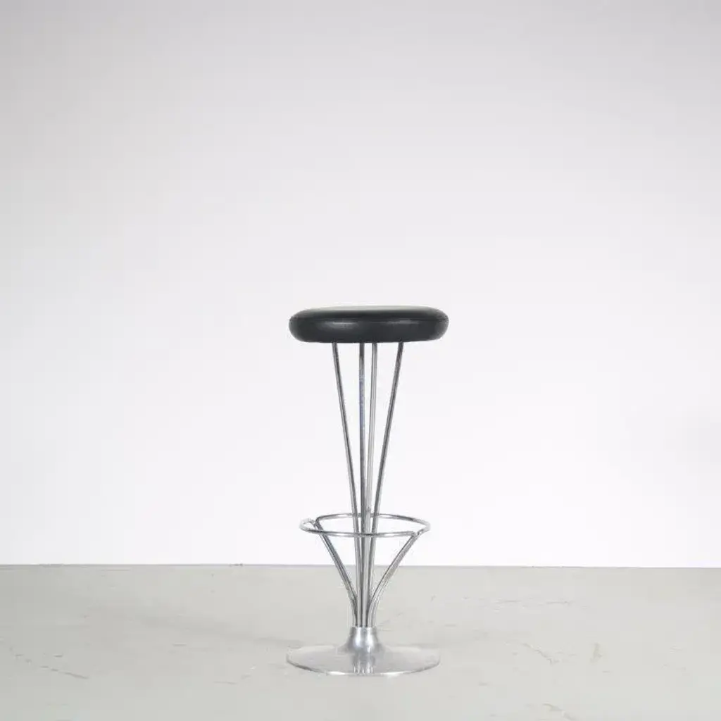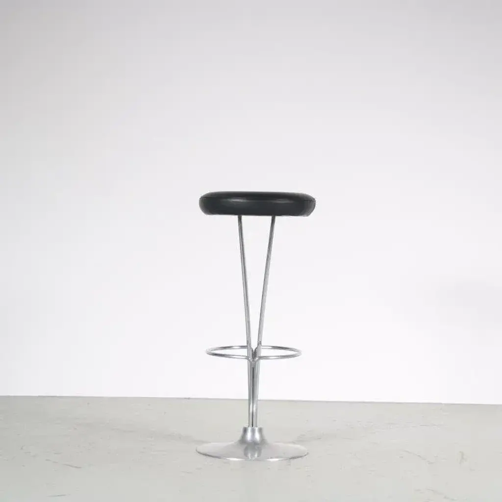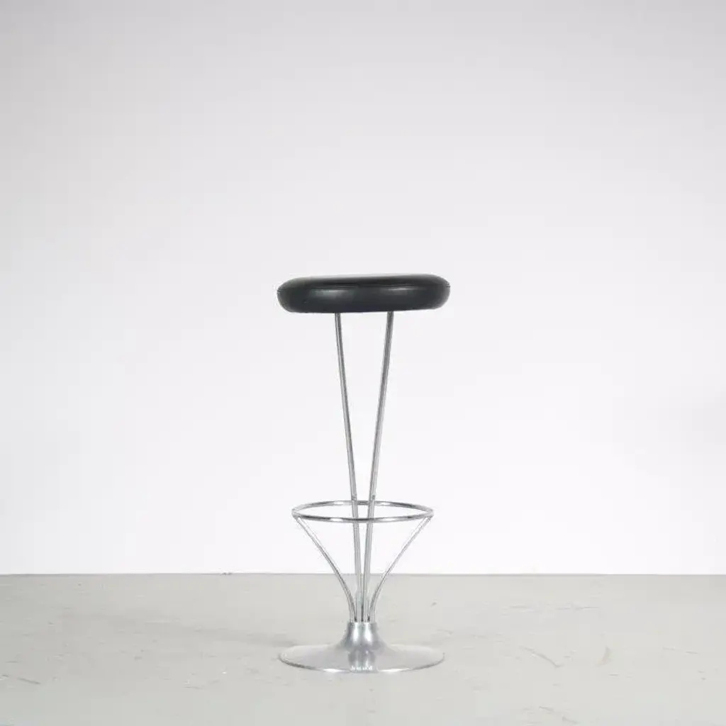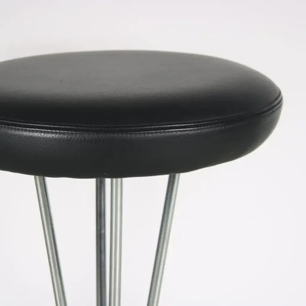 A beautiful bar stool designed by Piet Hein and manufactured by Fritz Hansen in Denmark around 2000. The thin, chrome plated tubular metal frame is tall and light and gives the stool a most elegant appeal. Nicely bent into shape and holding a round, black leather upholstered seat. The materials and design allow for a sense of luxury as well as modernism that makes this a timeless find. Labeled underneath the seat, as shown in photos. Each stool remains in good vintage condition with minor wear consistent with age and use, preserving a beautiful patina. I have official proof of authenticity such as vintage catalogs, designer records, or other literature sources and take full responsibility for any authenticity issues arising from misattribution