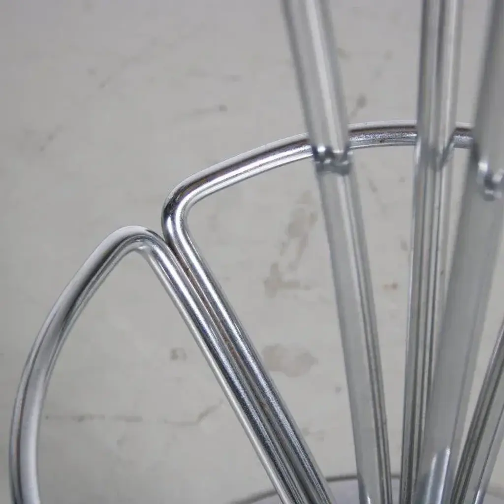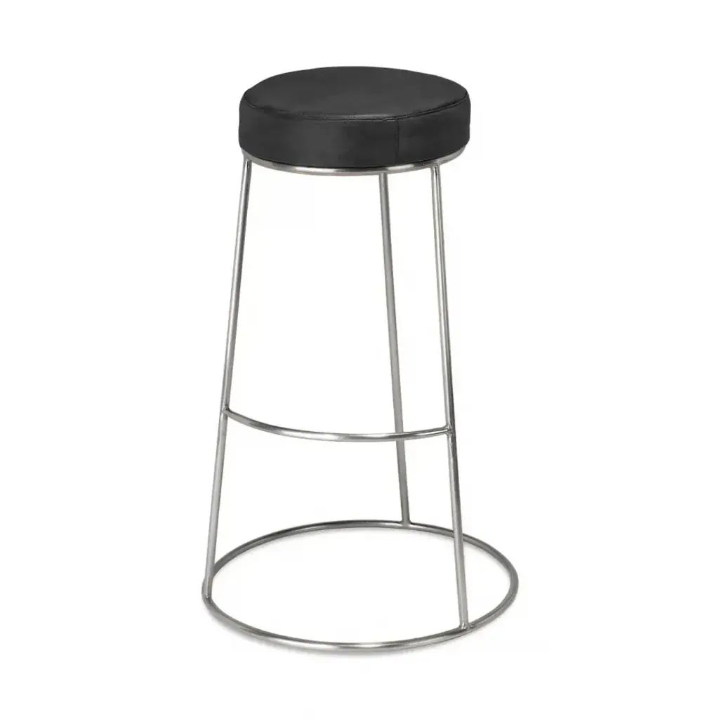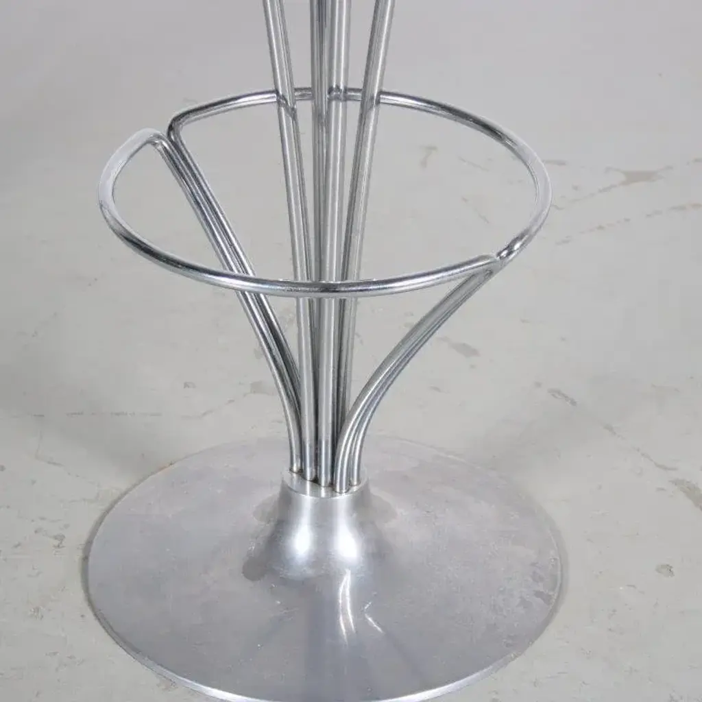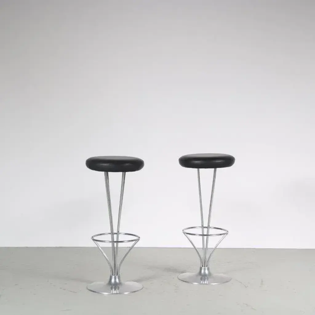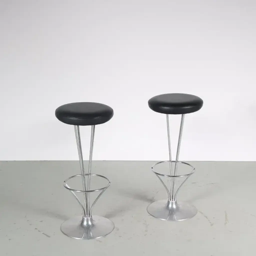 A beautiful bar stool designed by Piet Hein and manufactured by Fritz Hansen in Denmark around 2000. The thin, chrome plated tubular metal frame is tall and light and gives the stool a most elegant appeal. Nicely bent into shape and holding a round, black leather upholstered seat. The materials and design allow for a sense of luxury as well as modernism that makes this a timeless find. Labeled underneath the seat, as shown in photos. Each stool remains in good vintage condition with minor wear consistent with age and use, preserving a beautiful patina. I have official proof of authenticity such as vintage catalogs, designer records, or other literature sources and take full responsibility for any authenticity issues arising from misattribution