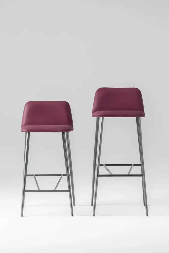 Upholstered leather bar stool with painted metal base from the BARDOT collection, designed by Emilio Nanni.