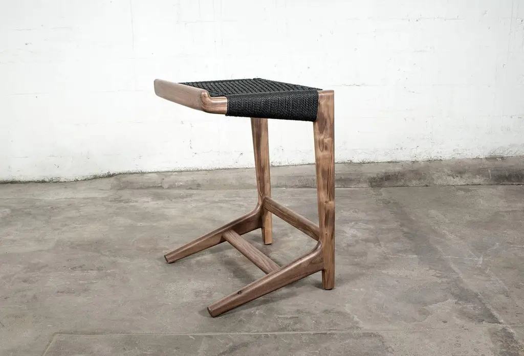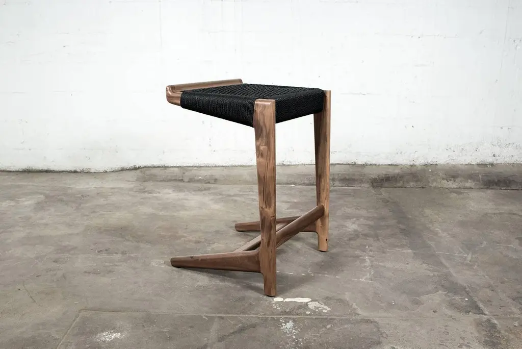 Mid-century inspired Walnut with Black Danish Cord Rian Cantilever Barstool. The lead time provided is an estimate and may extend up to 12 months. If you require delivery by a specific date, we kindly recommend inquiring prior to purchase to ensure availability.Can be made with any domestic or exotic hardwood of your choosing. Danish cord comes in three colors: Kraft, White and Black. The Danish cord has the perfect amount of give which makes for a very comfortable seat. All of our pieces are made-to-order and fully customizable. Our Rian cantilever collection was selected for the 2010 design Biennial at the Pasadena Museum of California Art. Hardwood cantilever frame with woven Danish cord seat deck. One of our most popular designs since it's debut in 2008. The lines were inspired by Scandinavian pieces from the late 1940s and 1950s. I was so in love with this collection that it had to be named after my beautiful wife, Rian.