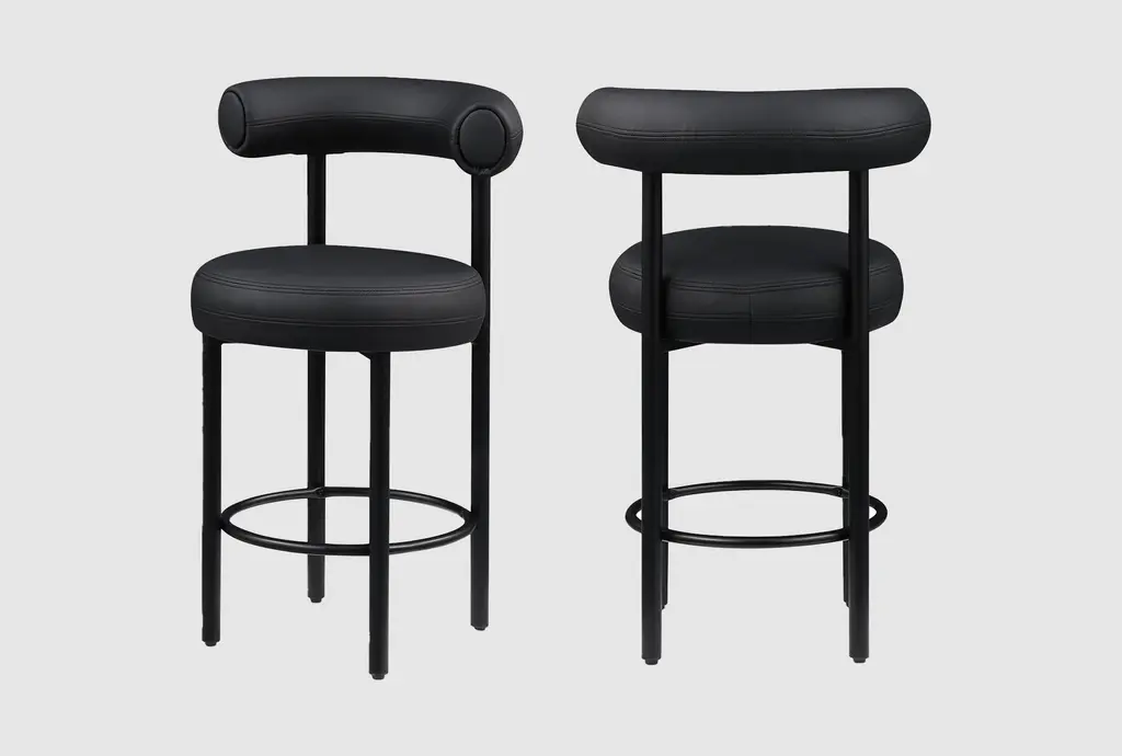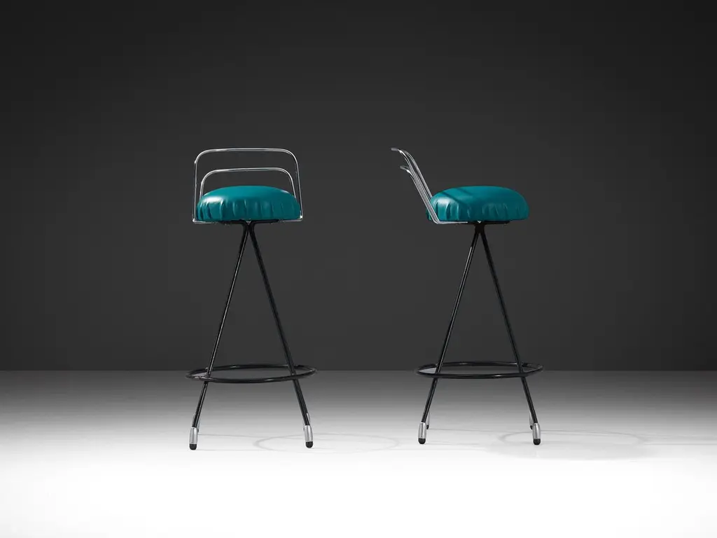 Barstools, chrome-plated metal, metal, leatherette, Europe, 1960s. Set of eccentric barstools executed in black lacquered metal with green faux leather seatings. Its design shows clean and geometrical features characteristic for modern mid-century furniture. The four metal legs are placed slantwise and bundled underneath the seat operating as a solid support. A footrest ring is placed around the legs. The rounded low backrest is executed in chrome just as the glides. The seatings are upholstered in teal green leatherette.