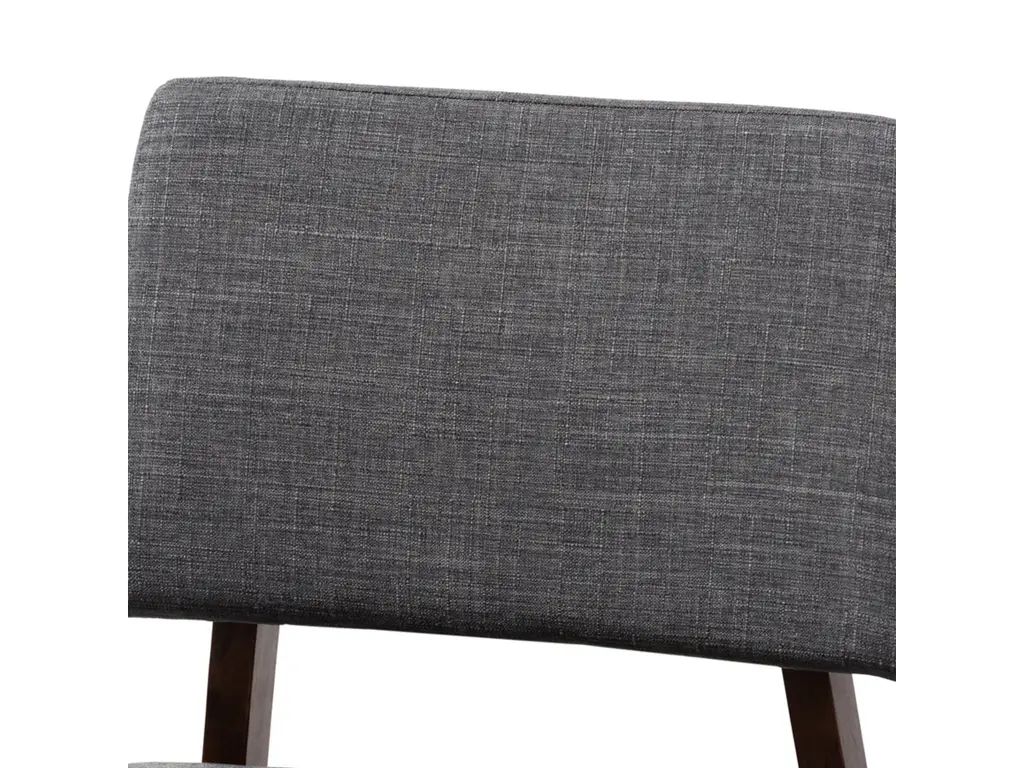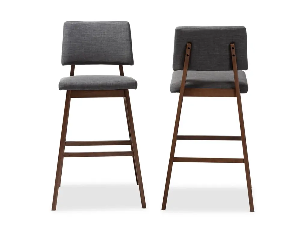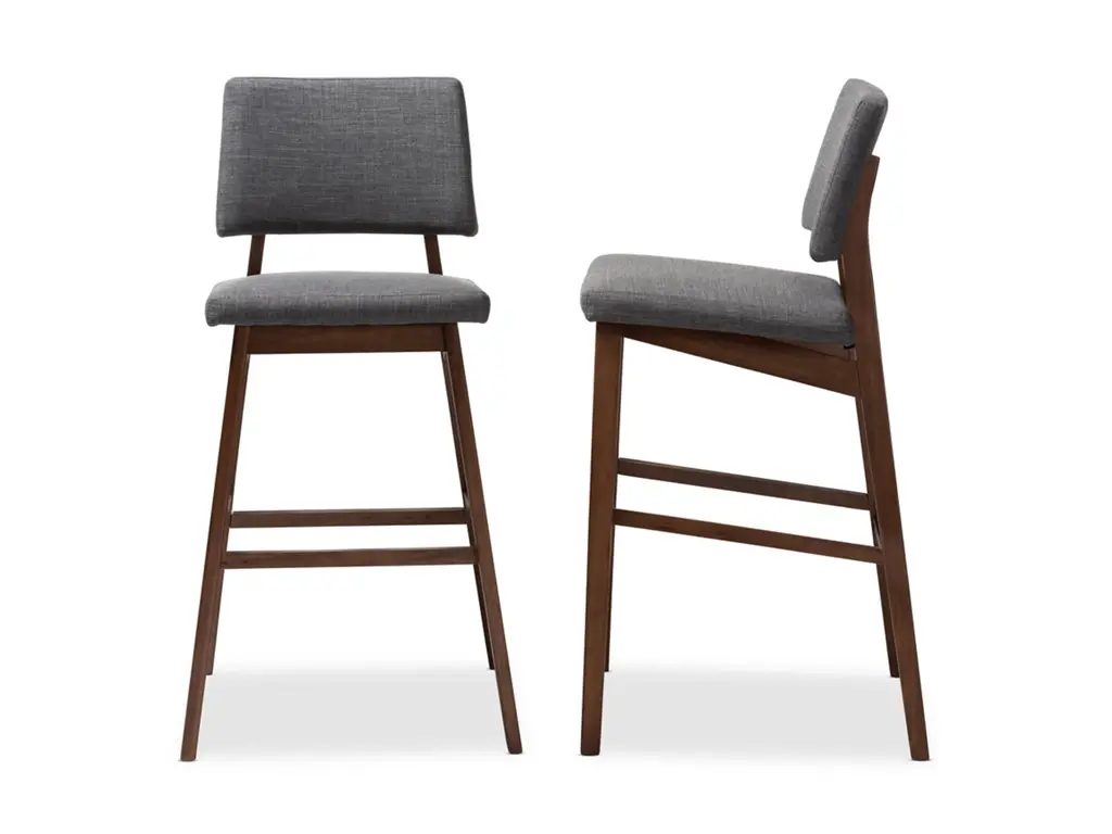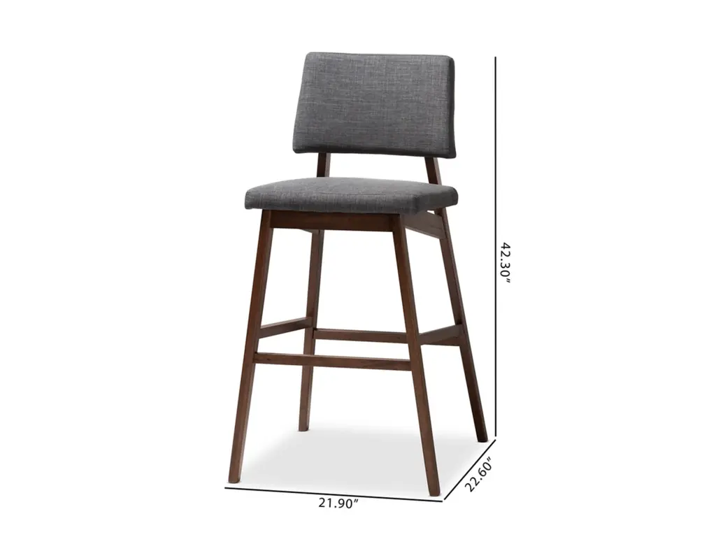 Give your bar space a dose of retro style with the Colton bar stool. Constructed from solid rubberwood, it showcases a rich walnut brown finish. The seat and back are upholstered in a durable neutral polyester fabric that is easy to coordinate with any color palette. The slanted back and built-in footrest offer lasting comfort as you enjoy a cocktail or two. Inspired by mid-century modern design, this bar stool features long, angled legs. Ideal for both a kitchen and bar setting, it's easy to coordinate with a wide range of decor schemes. The Colton bar stool is made in Malaysia and requires assembly.