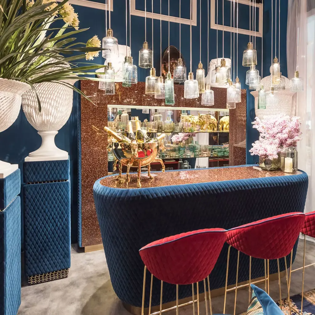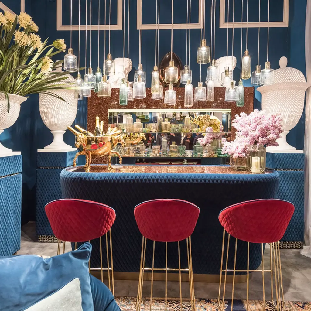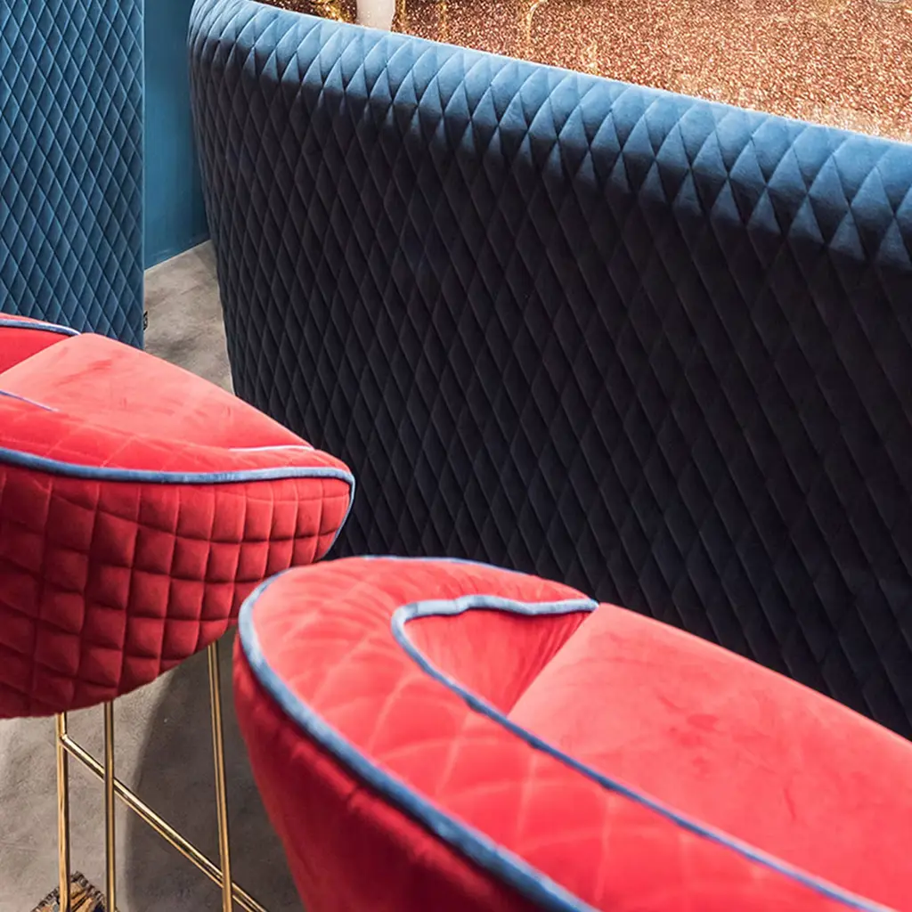 A lavish design piece that will stand out in any elegant interior setting, this gorgeous stool features a distinctive silhouette handcrafted of high-quality materials. Resting on a tubular metal base finished with 24K gold, the padded seat with a quilted backrest is upholstered with a spectacular red fabric.