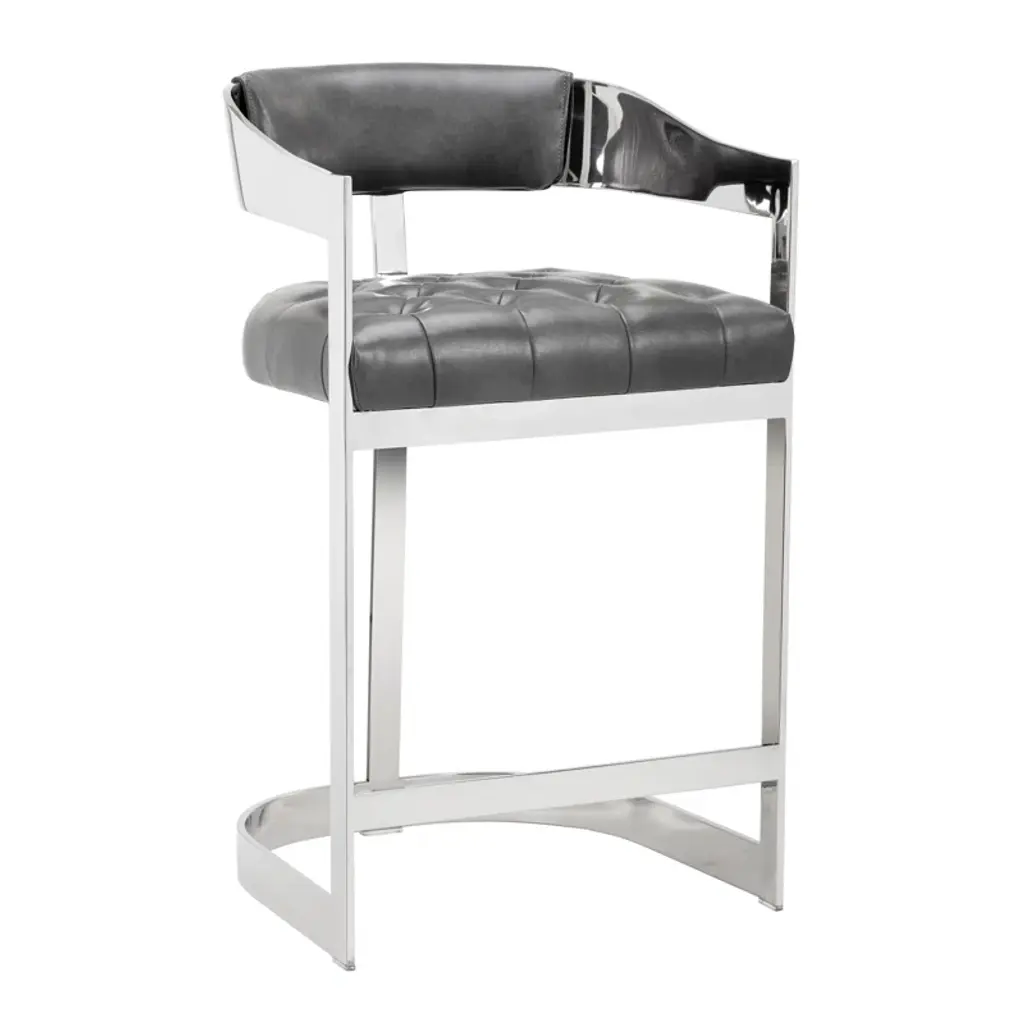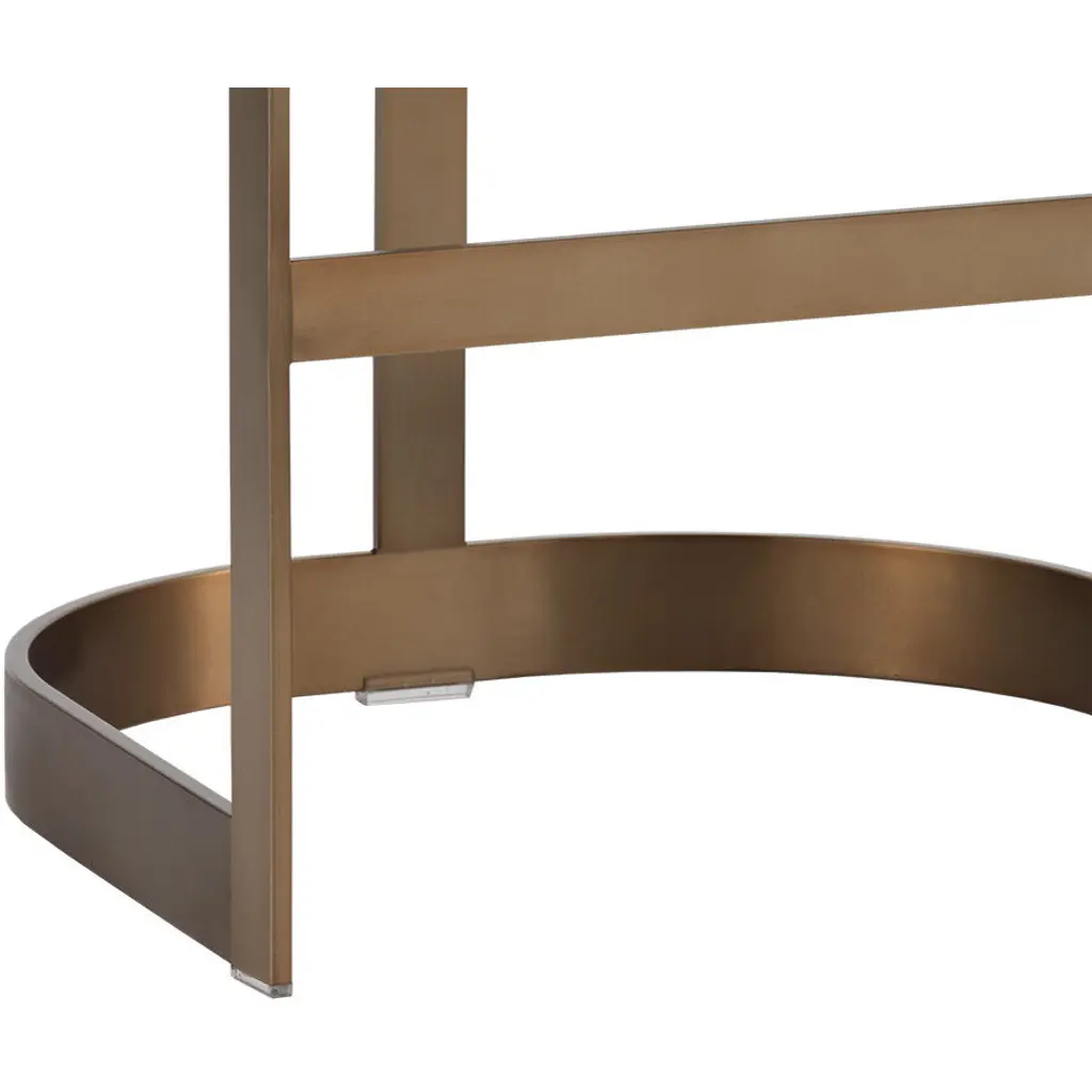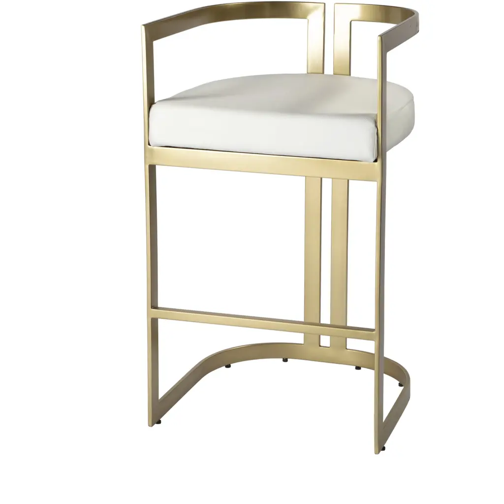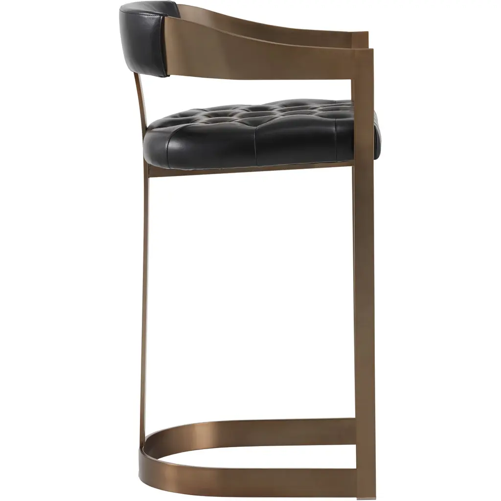 This ultra contemporary stool features a T-shaped back, tapered arms and an antique brass crown base. Stocked in cantina black bonded leather. Perfectly suited for commercial and residential settings. Suitable for various dining, kitchen and bar spaces of all sizes. Handle with Care: This design has been crafted with bonded leather. Bonded leather is a blend of reconstituted leather and synthetic materials crafted to reflect the natural characteristics of leather as such, colour variations, markings, wrinkles, grooves and light scratches are acceptable and appreciated characteristics. No two pieces are alike. Visit our Product Care page for more information on how to ensure the lasting beauty of this piece.