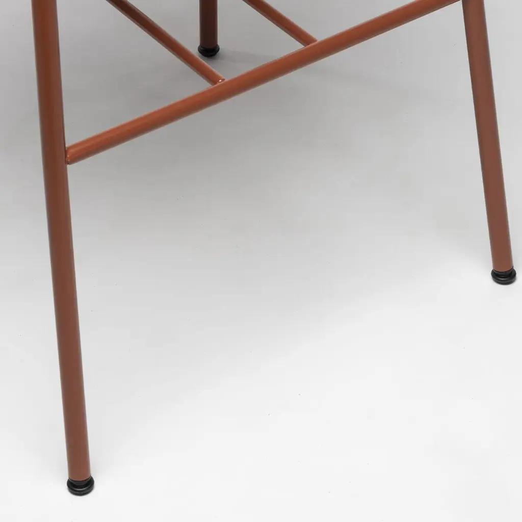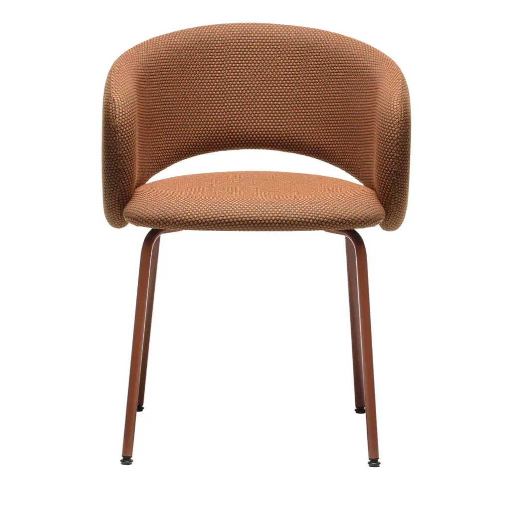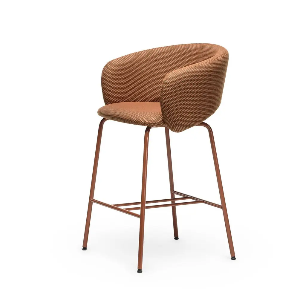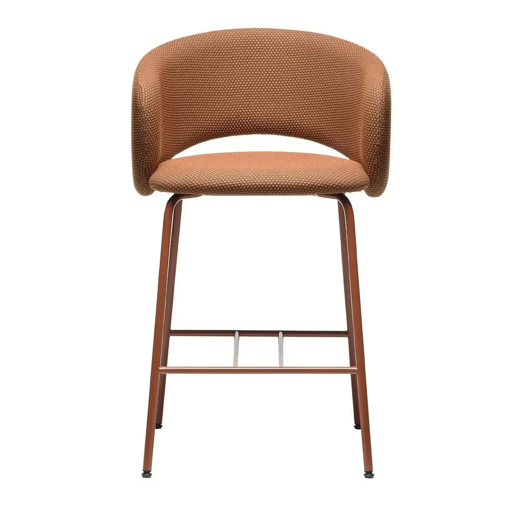 A bar stool featuring a sleek terracotta powder-coated metal base, elegantly upholstered with fabric. The Bel collection is inspired by the 'Bel Design Italiano' that appeared in the 1950s in Italy. It's a design trend that combines Italian tradition with burgeoning creative and technical innovation. The key to this trend was the promotion and creation of formally very attractive designs. The Bel stands out for its versatility, available with different bases.