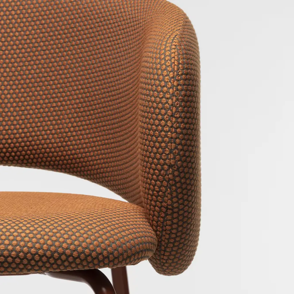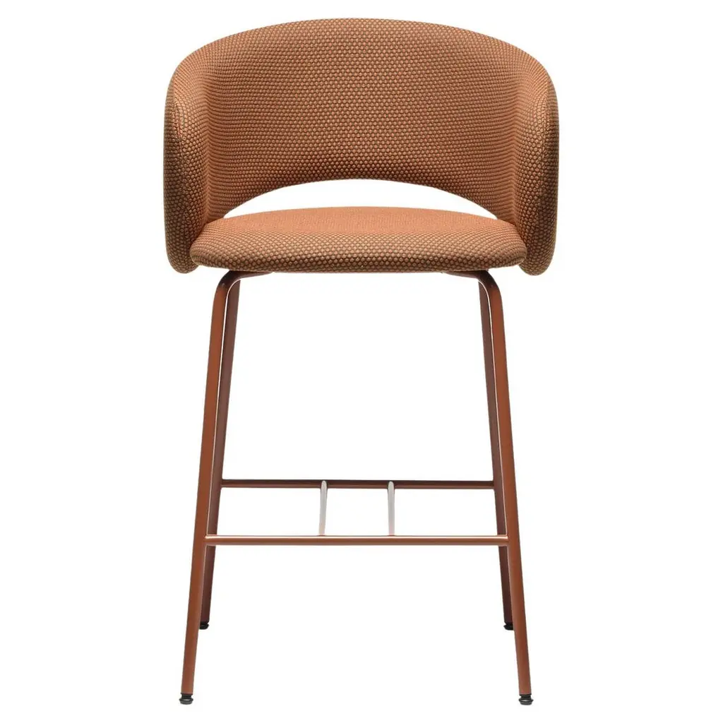 A bar stool featuring a sleek terracotta powder-coated metal base, elegantly upholstered with fabric. The Bel collection is inspired by the 'Bel Design Italiano' that appeared in the 1950s in Italy. It's a design trend that combines Italian tradition with burgeoning creative and technical innovation. The key to this trend was the promotion and creation of formally very attractive designs. The Bel stands out for its versatility, available with different bases.