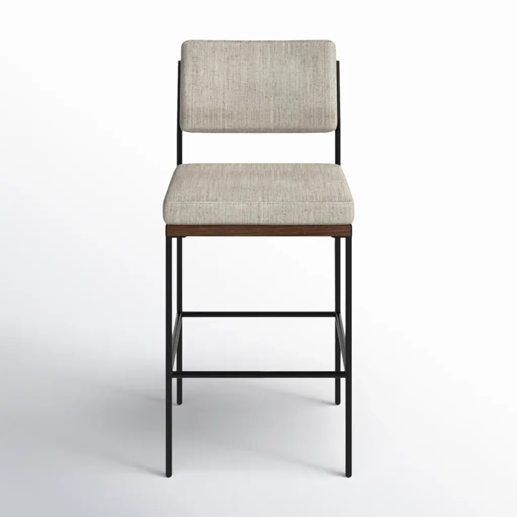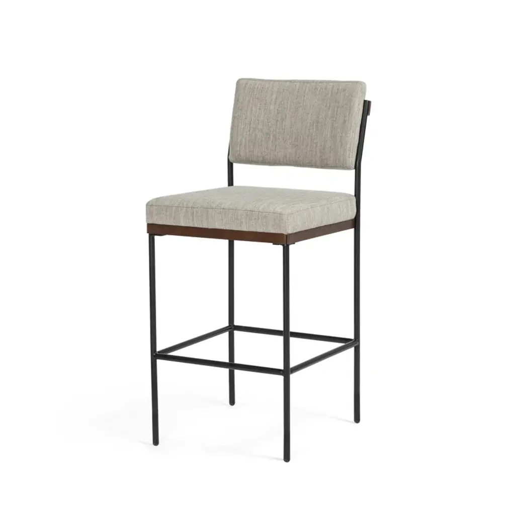 Simple and streamlined with fresh, thoughtful details. Slim, black-finished round stock iron suspends an almond-finished nettlewood deck, with a flannel-colored linen-blend seat and floating back with a rear wooden stretcher.