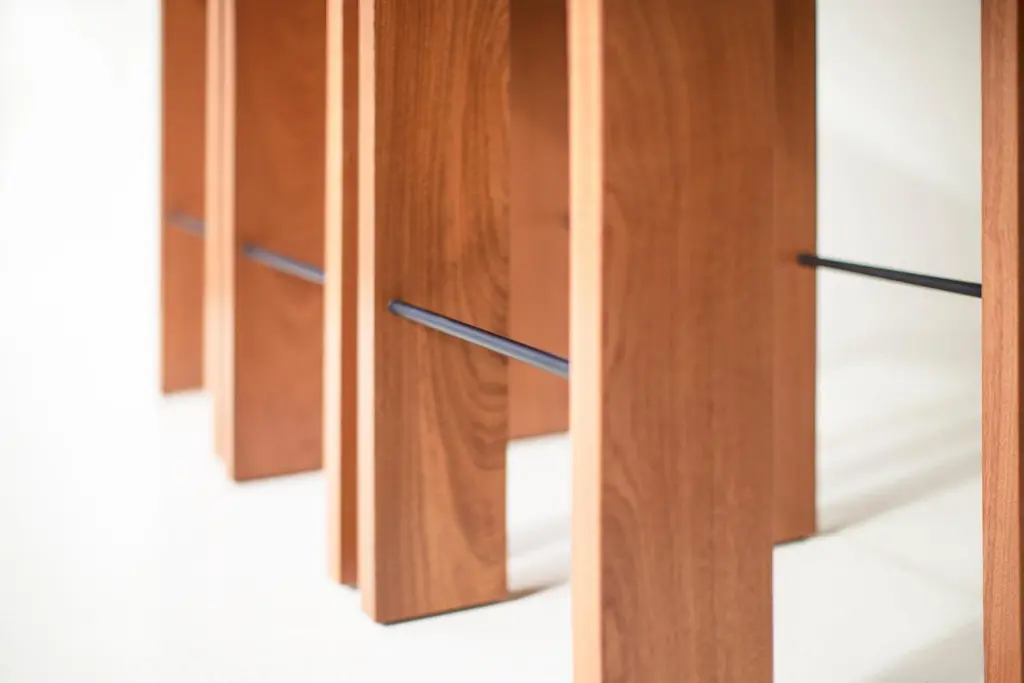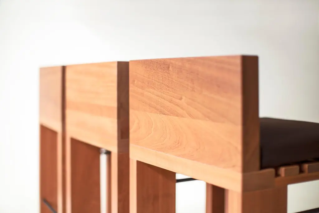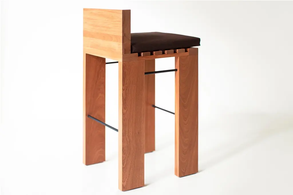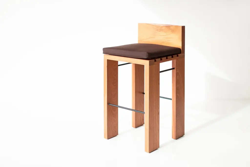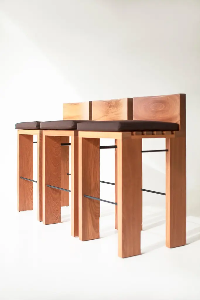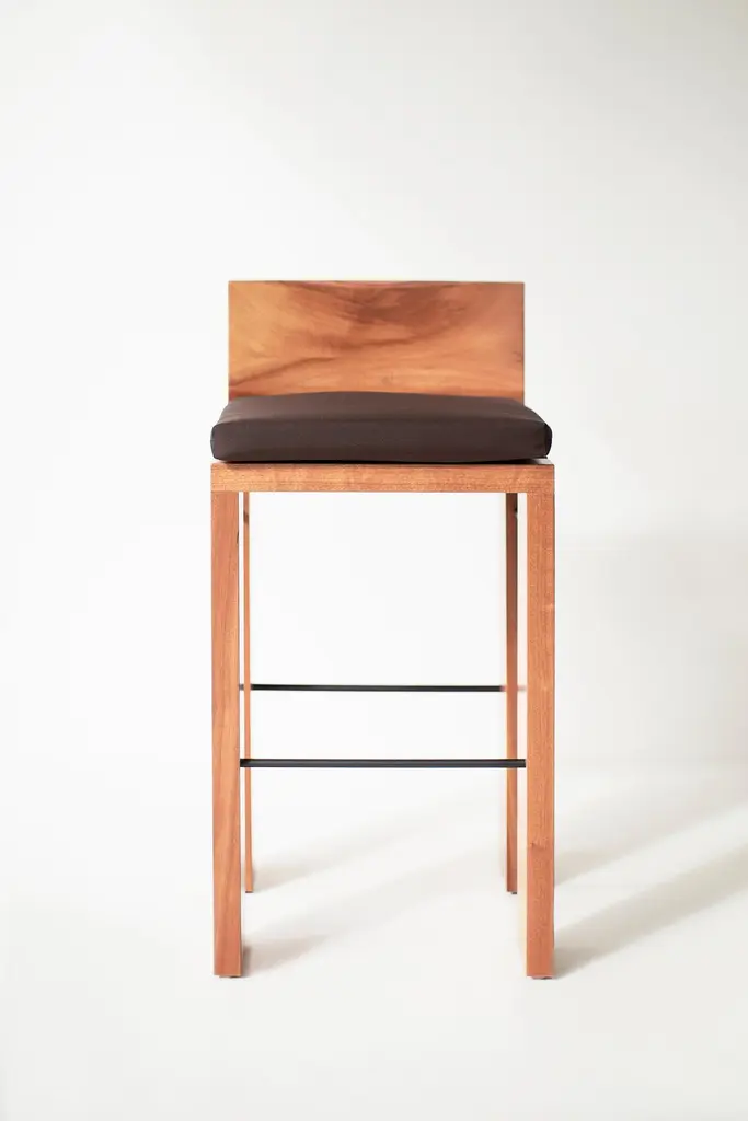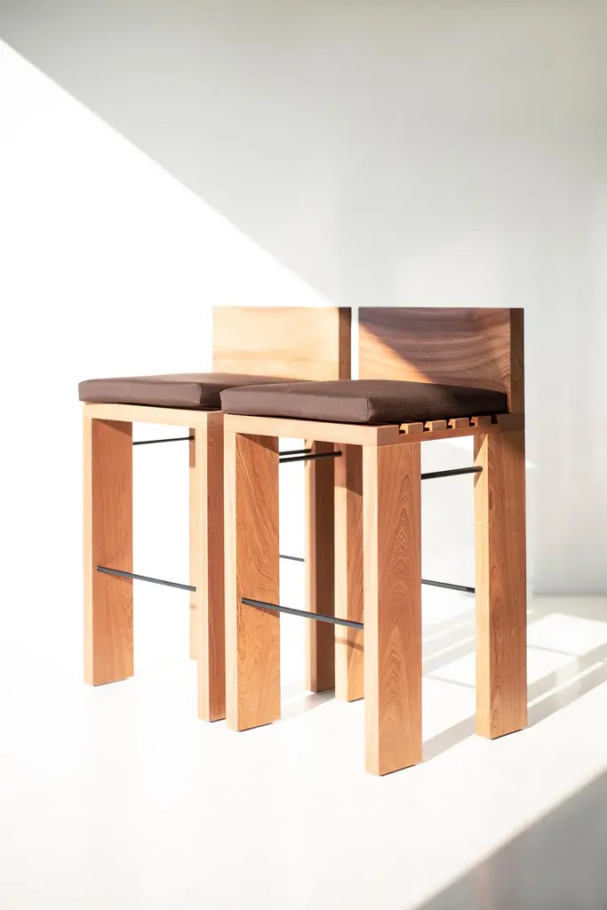 These Chile Outdoor Bar Stools in Natural are beautifully constructed from solid wood in Ohio, USA. The bar stool is chunky and modern with a comfortable cushion made for outdoor use. Black metal rods complete the frame for stability, function, and aesthetic. We offer these bar stools in dining seat height or counter height as well. These, of course, can be made for indoor use in this wood, alder, white oak, maple, or walnut. Performance outdoor fabric is included in the price. Many colors and textures available! Contact us for colors and samples. COM is always an option.specsPeriod/Model: New; Modern Specs: Mahogany, Natural Exterior FinishCustomizable: Yes! It's what we do :)dimensionsH: 34"W: 18.5"D: 19"Seat H: 28"Seat D: 18.5"