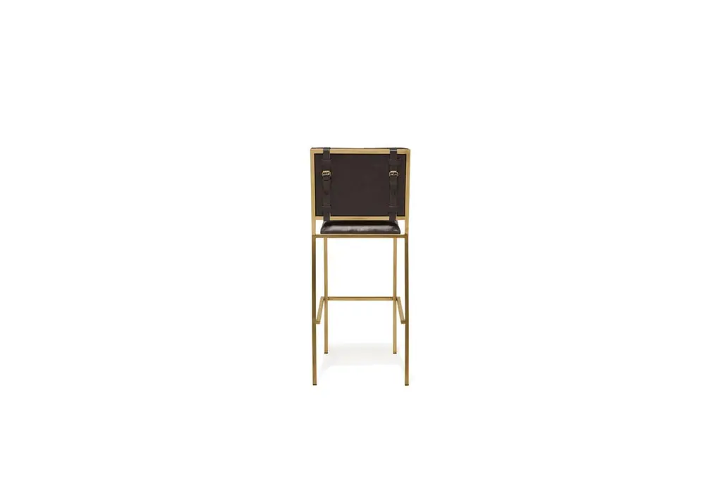 The Inheritance Barstool by Stephen Kenn is comfortable, stackable, and extensively customizable. It has been designed to withstand the rigors of a bar or restaurant environment, while still elegant enough to fit well in a residential home. Every Stephen Kenn piece is made to order through our Los Angeles studio in partnership with a number of small businesses and fabricators in the LA area. The design is highly customizable, so you can select from a range of metal finishes and upholstery materials that will complement your space and durability needs - please message us to see our Customization Guide with all available options.This version of our Inheritance Barstool is upholstered in black leather from the Valhalla Collection by Moore & Giles. The foam seat cushion sits atop an antique brass plated frame. The back rest is strapped with belts featuring black leather, and antique brass buckles.