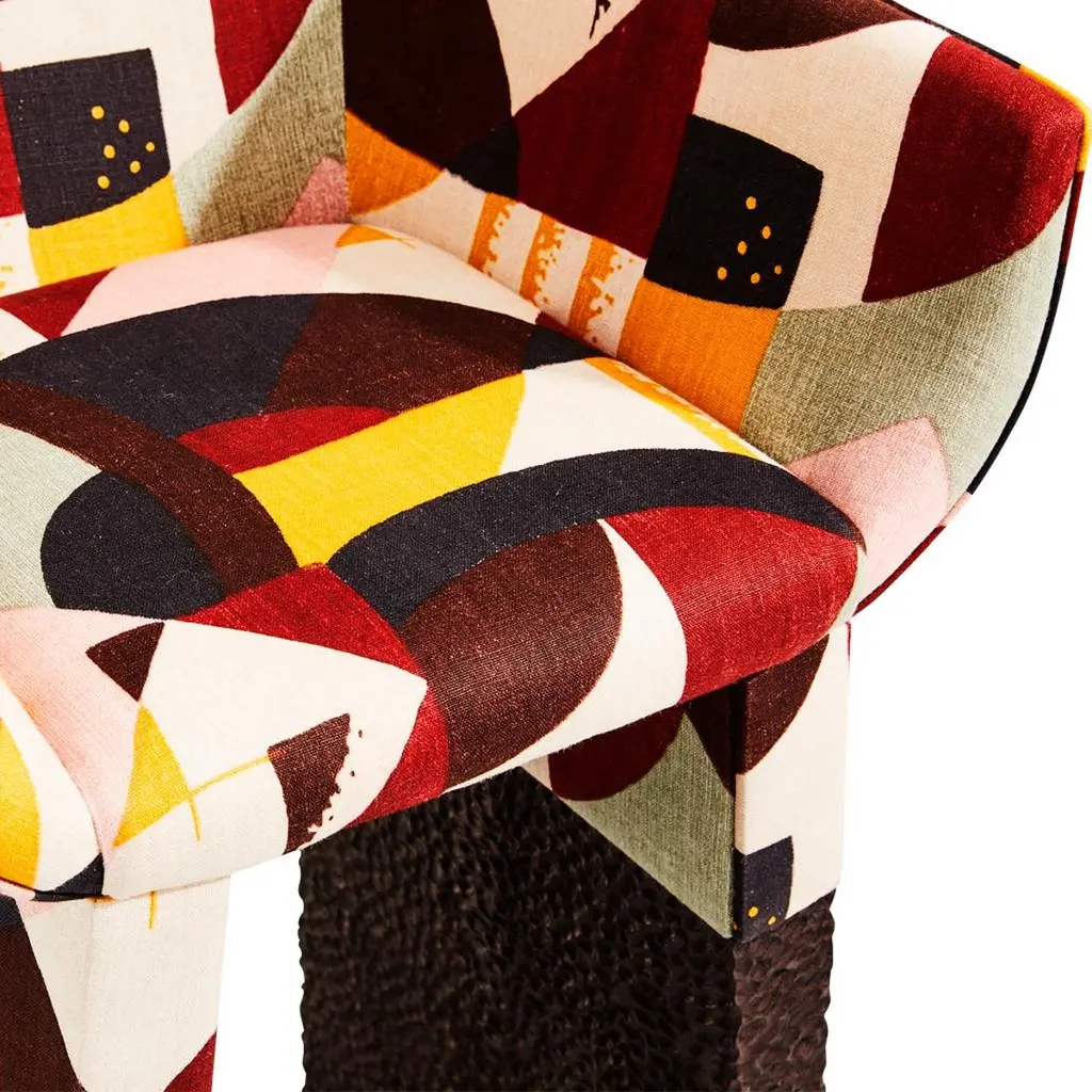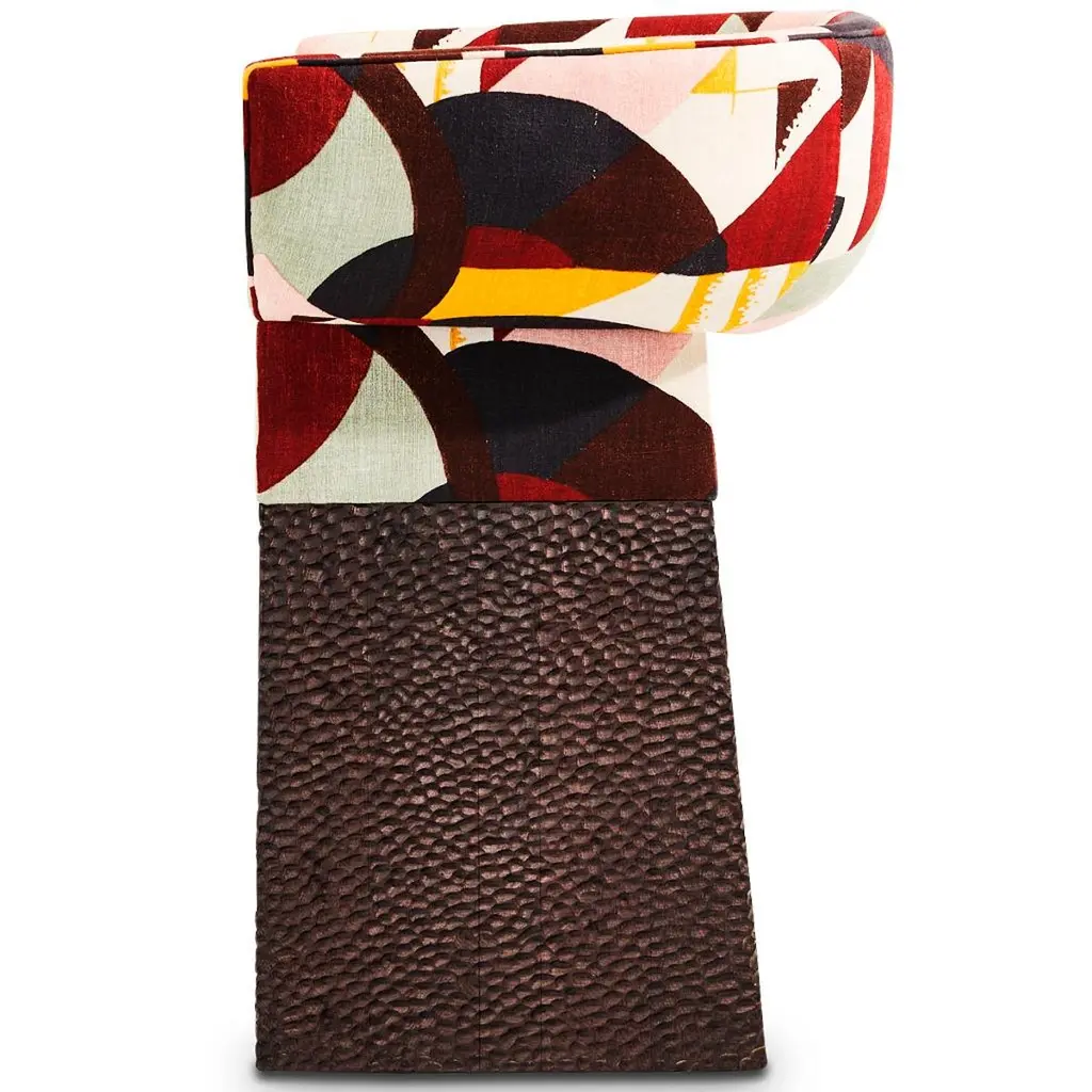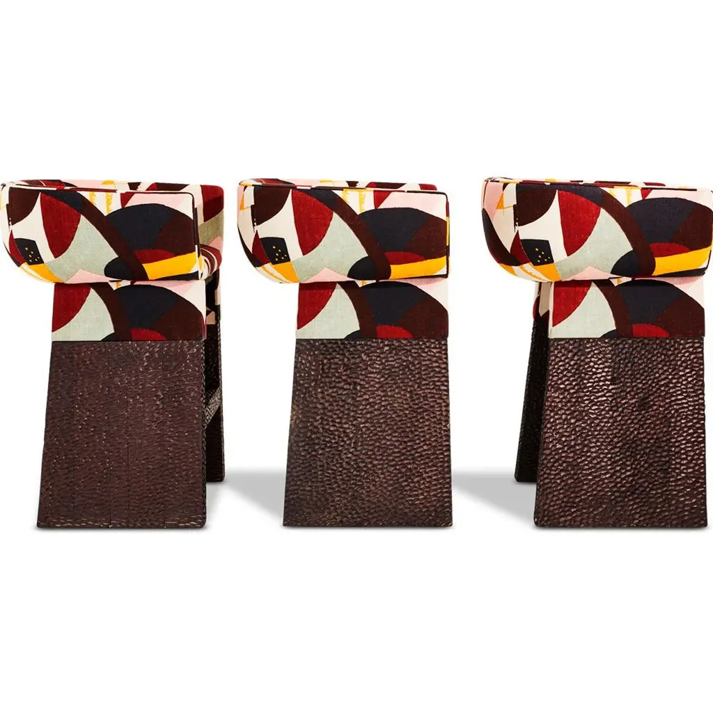 The Blessing upholstered barstool is part of our Blessing collection designed by Egg Designs and manufactured in South Africa.The Blessing barstool has a base is hand-carved and chiseled solid Oak, the oak is then burnished to create an ebonized appearance. The shape of the base has strong lines which add to its unique and unusual appeal. The base is topped with a strong graphic pattern scalloped tub shaped seat which ensures that the barstool is incredibly comfortable. These barstool make a strong statement when they are lined up together around the bar. The barstool can be altered to kitchen counter height. The base is also available in natural Oak with alternative fabric options for the upholstery.