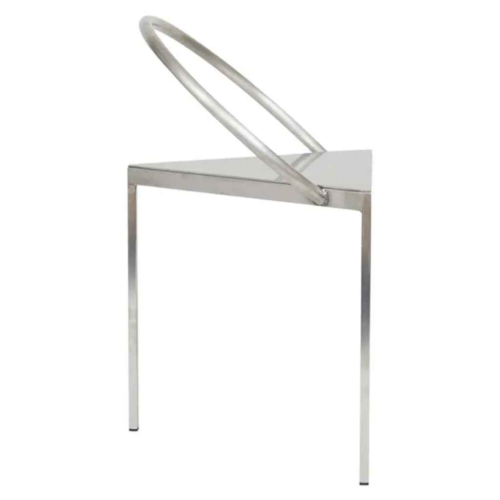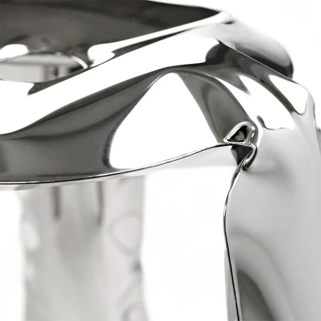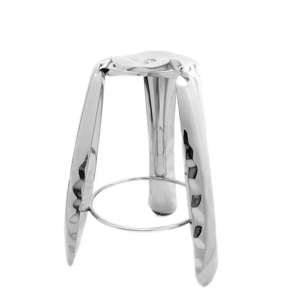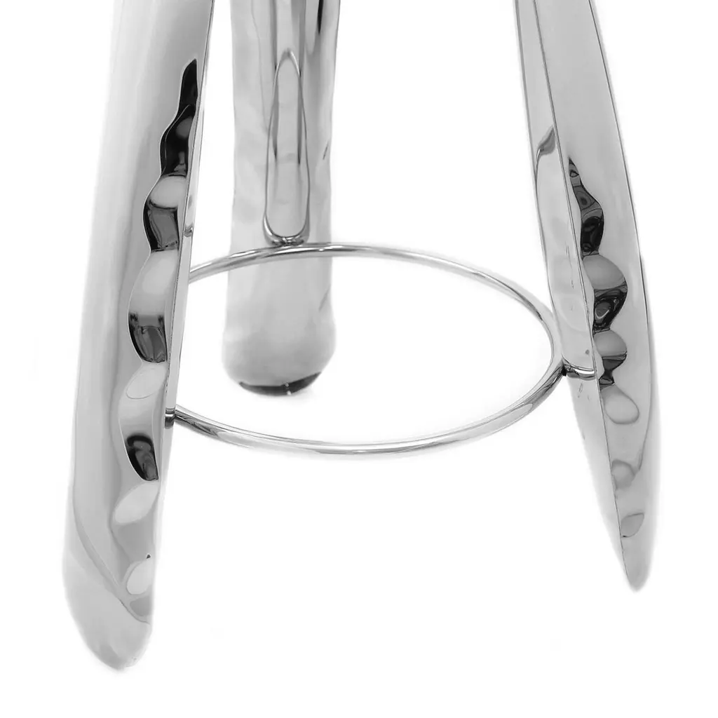 Bar stool bloat made in polished stainless steel,using bending properties of steel sheets. Withcircular footrest.