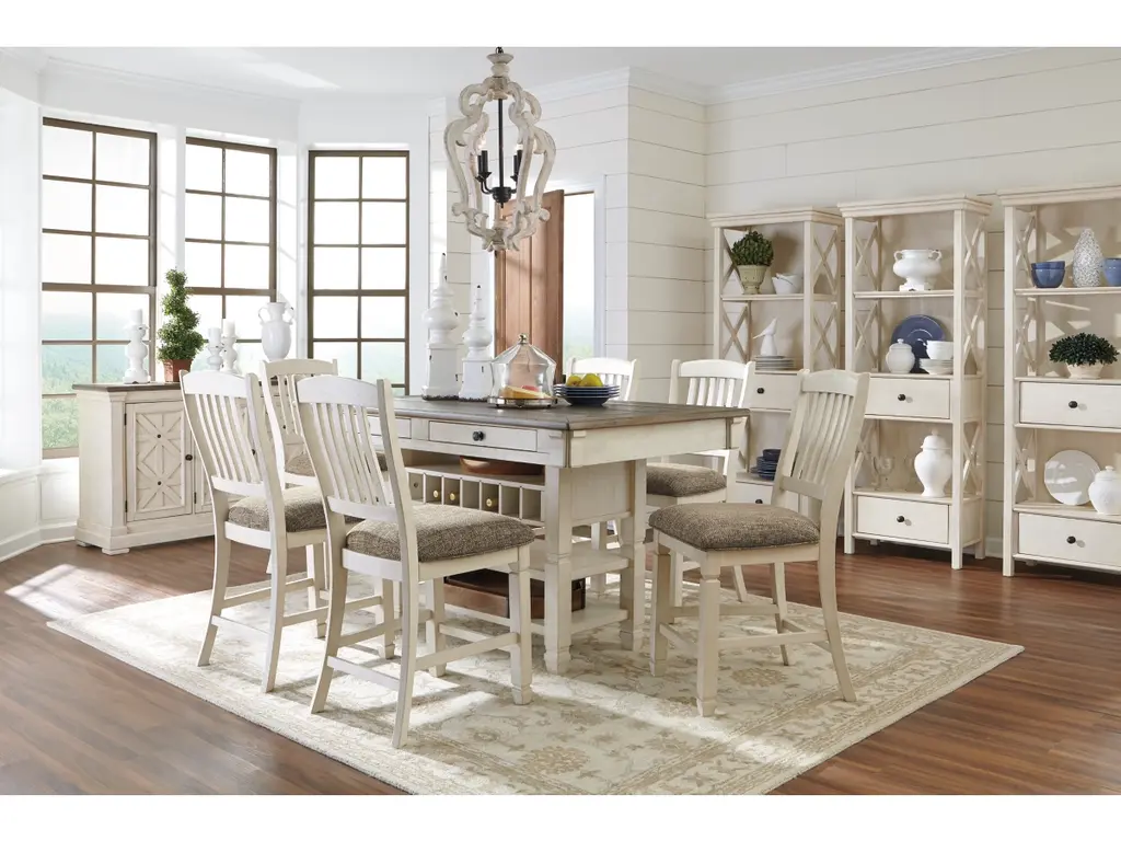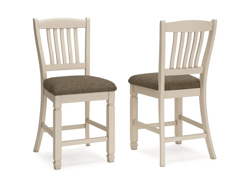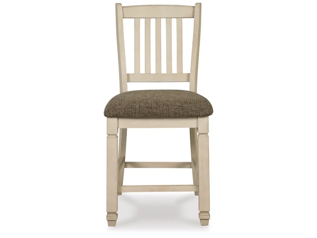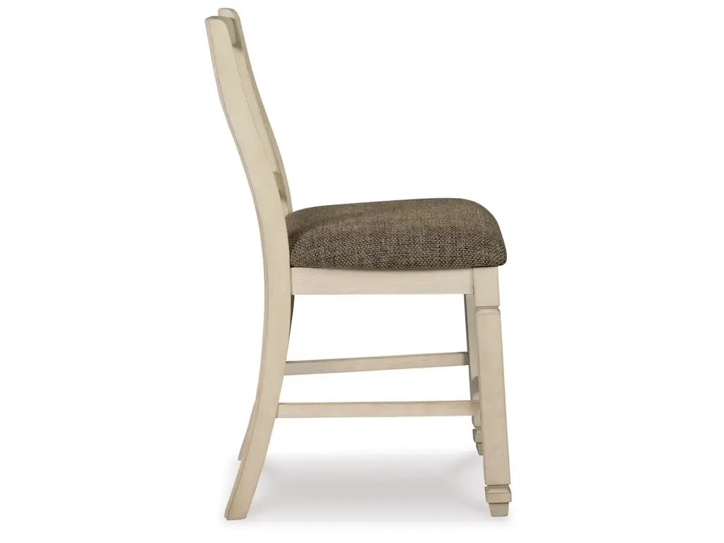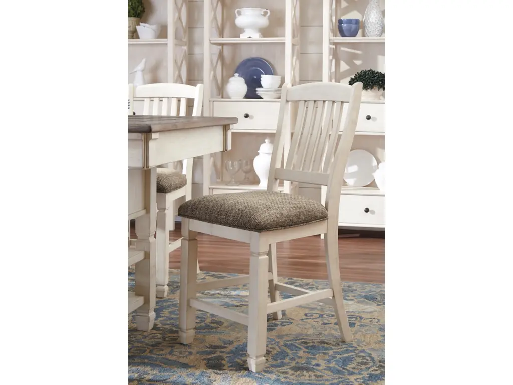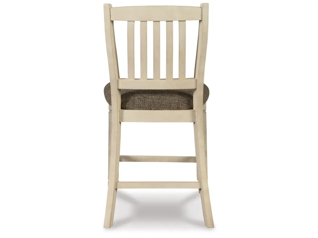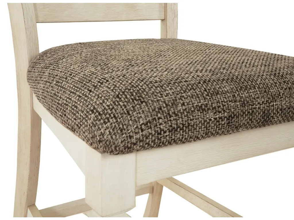 The beauty of the Bolanburg upholstered bar stool is something to savor. Designed to serve up comfort and flair, this rake-back bar stool entices with a cushioned seat covered in a heavy woven fabric that complements the antiqued white finish.