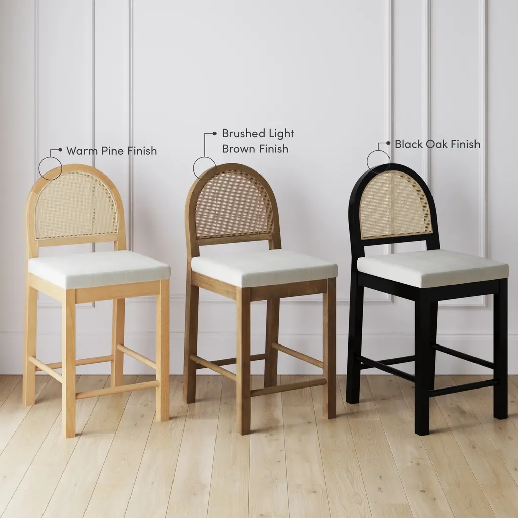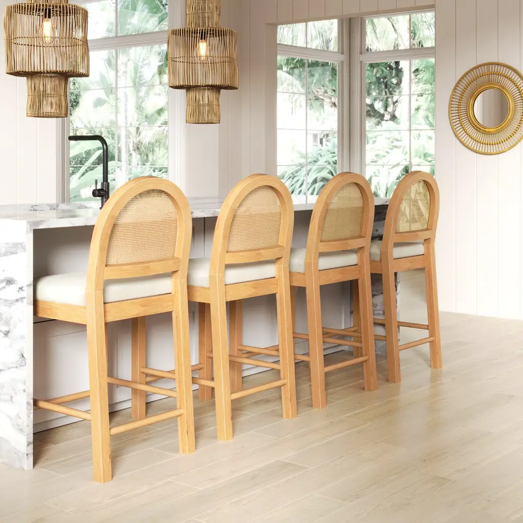 You don't need to be a Michelin star chef to have the kitchen of your dreams! This is where the Bailey bar stools come in. They feature a curved silhouette back made of woven natural rattan and are paired with an oak finish frame and bright boucle textured seat. Grab your favorite drink and sit for hours on the generously padded seats, while kicking your feet up on the durable foot rests. This set of 2 mixed-material bar stools work in a variety of settings and are sure to bring warmth and comfort to your kitchen or dining room spaces.
