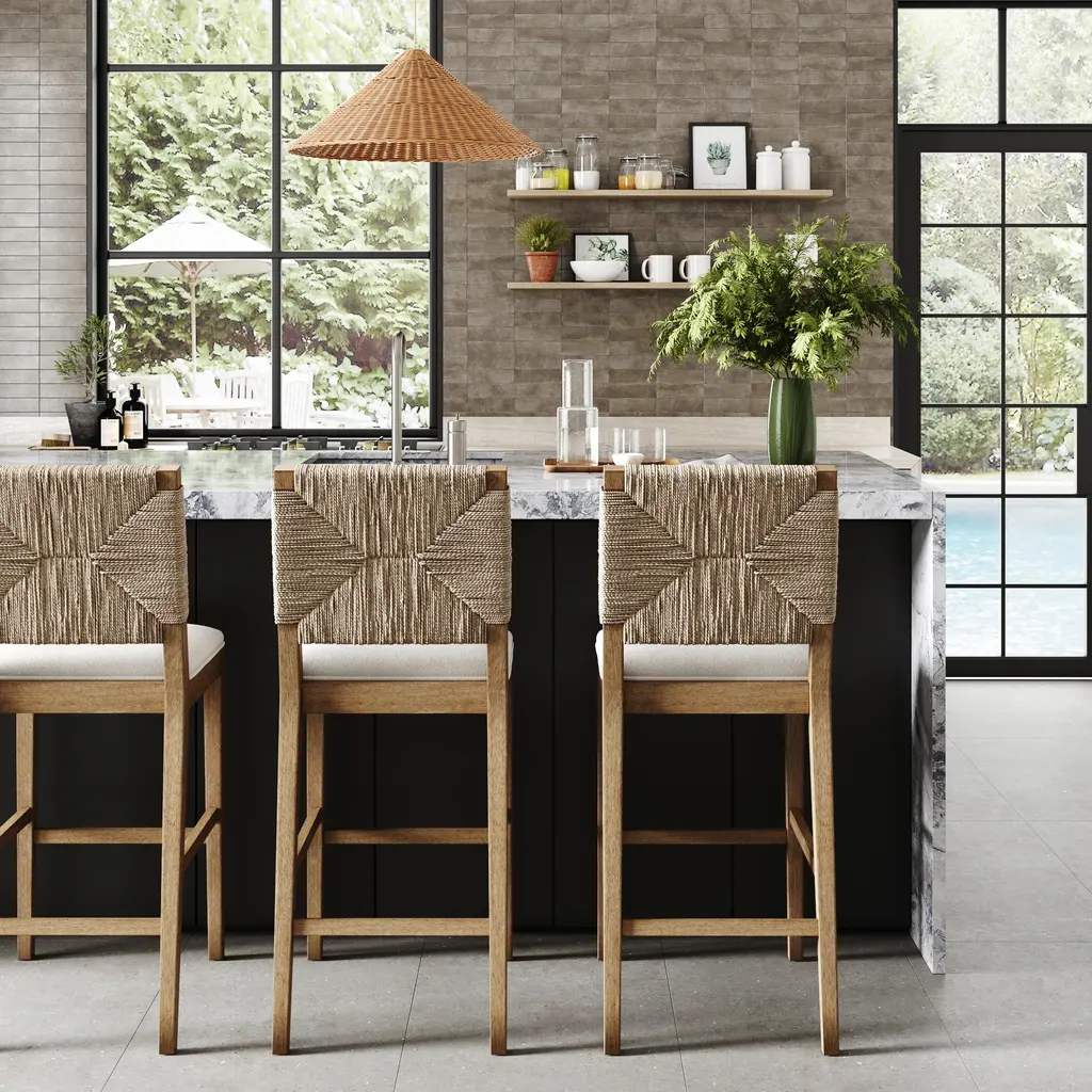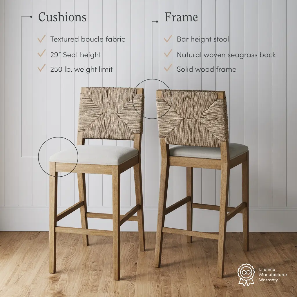 Introducing the Beacon Bar Stool—where comfort meets style right in your kitchen! With its natural seagrass woven backrest, you'll be reminded of breezy seaside getaways, while the plush textured cream boucle seat promises endless hours of comfort. And let's not forget its solid wood frame in brushed light brown, which doesn't just offer durability but also adds that classic touch to your space. Whether you're sipping morning coffee or enjoying a late-night snack, the Beacon Bar Stool is your perfect companion. Pair with the other pieces in our Beacon collection for the perfect matching set.