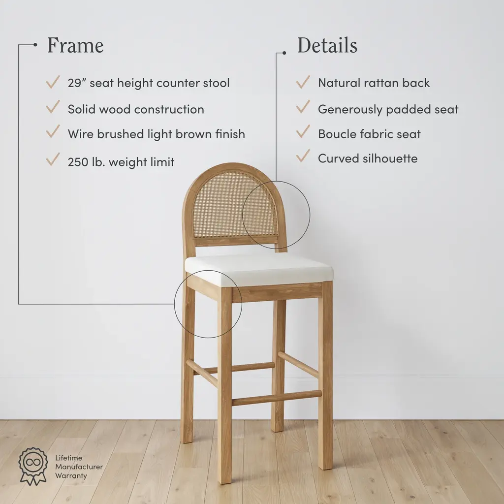 You don't need to be a Michelin star chef to have the kitchen of your dreams! This is where the Bailey bar stool comes in. It features a curved silhouette back made of woven natural rattan and is paired with a wire brushed light brown finish frame and bright boucle textured seat. Grab your favorite drink and sit for hours on the generously padded seat, while kicking your feet up on the durable foot rest. This mixed-material bar stool works in a variety of settings and is sure to bring warmth and comfort to your kitchen or dining room spaces.