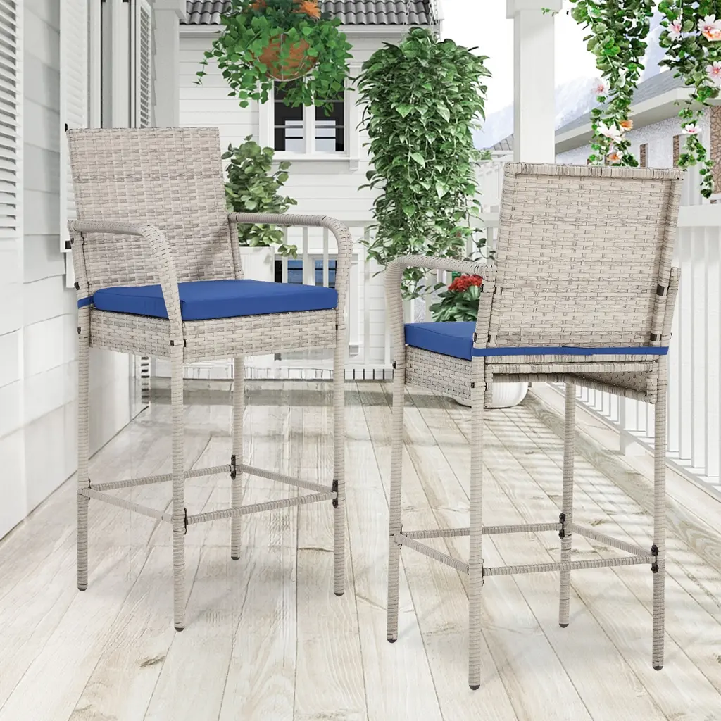 Simple, affordable and beautiful, the barstool is all about sharp lines, and beautiful sleek design. This barstool proves that being minimal can still be engaging, comfortable, and beautiful in a patio furniture setting.Features:Custom hand woven all-weather, high density, PE (polyethylene) wicker• Strong rust-resistant powder coated aluminum frame for maximum durability• Commercial grade construction• Perfect for outdoor use in all climates• Fully Assembled - ready to use and enjoy• 3 Year Limited Manufacturer's Warranty with every setSpecifications:(4) Barstools w/ Back - 18"W x 19"D x 43.5"HSeat Height: 30"