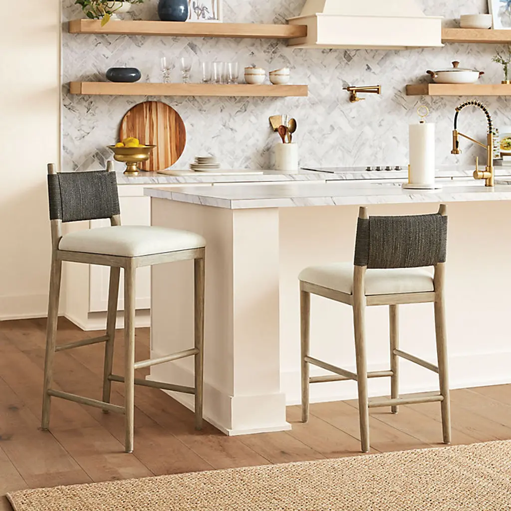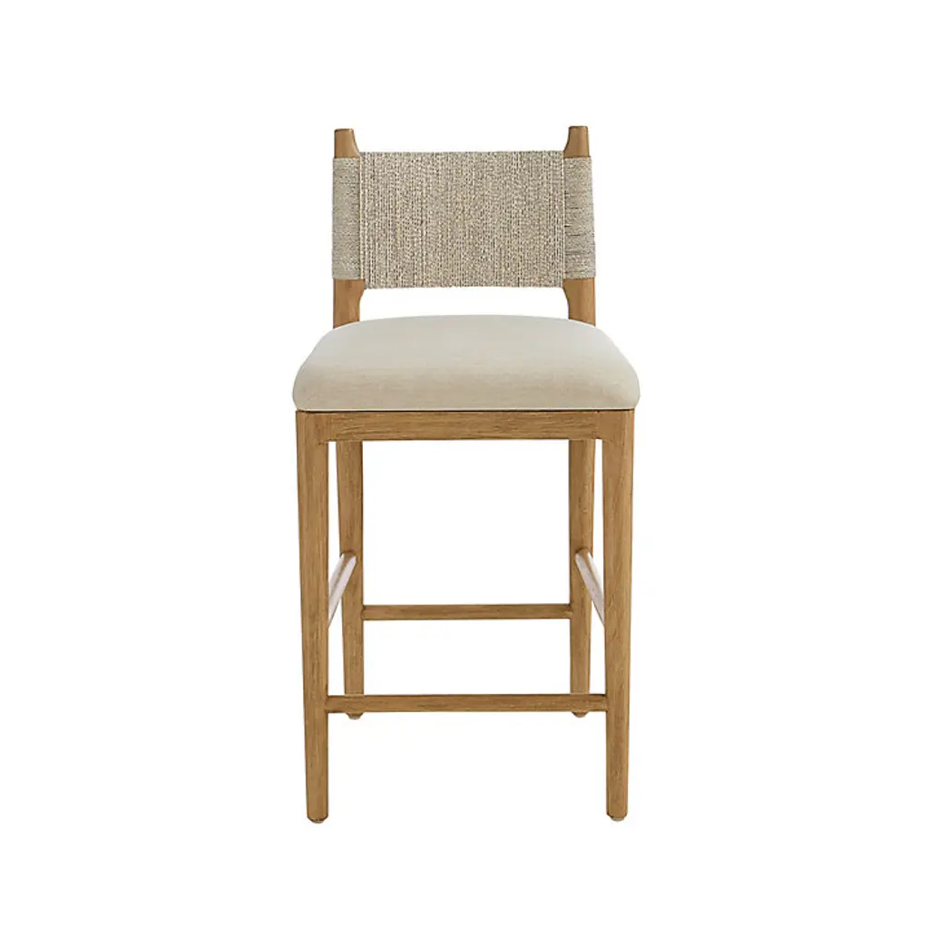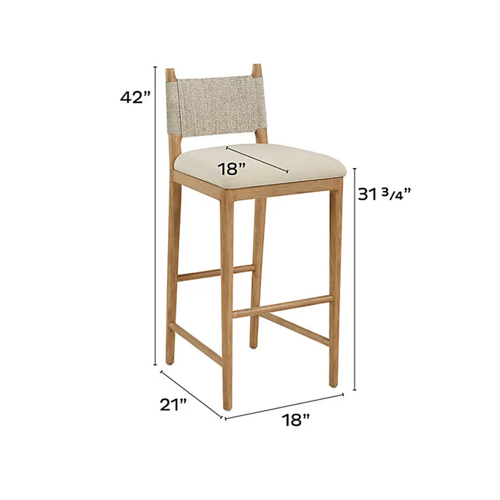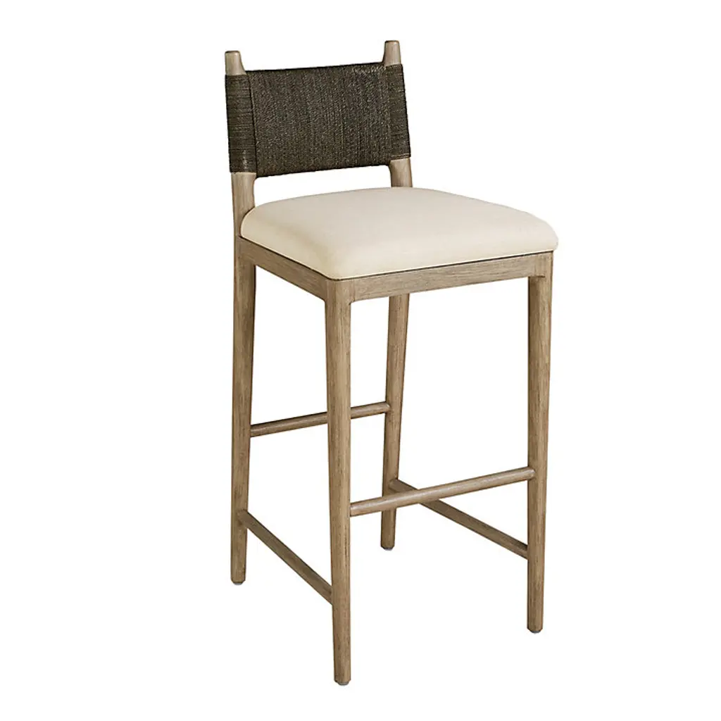 Our Bridget Bar and Counter Stools offer a stylish blend of unexpected textures. Their comfortably canted backs are hand woven in double seagrass rope. Deeply padded seats are upholstered in a linen blend fabric and removes for easy recovering. We recommend our stylish, washable Performance Fabrics for spill-prone areas like the dining room, eat-in kitchen and breakfast nook. The clean-lined frames are artisan crafted of solid mahogany with floating joints for enduring strength, and hand finished in warm stain to bring out the wood's rich grain. These fashionably unconventional bar stools and counter stools transition easily from classic to modern kitchen decors.Bridget Bar & Counter Stool features: