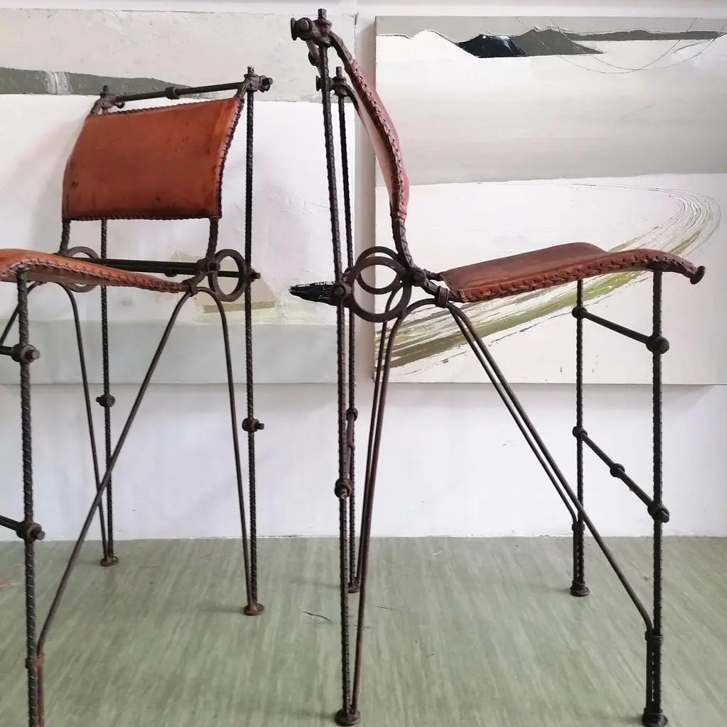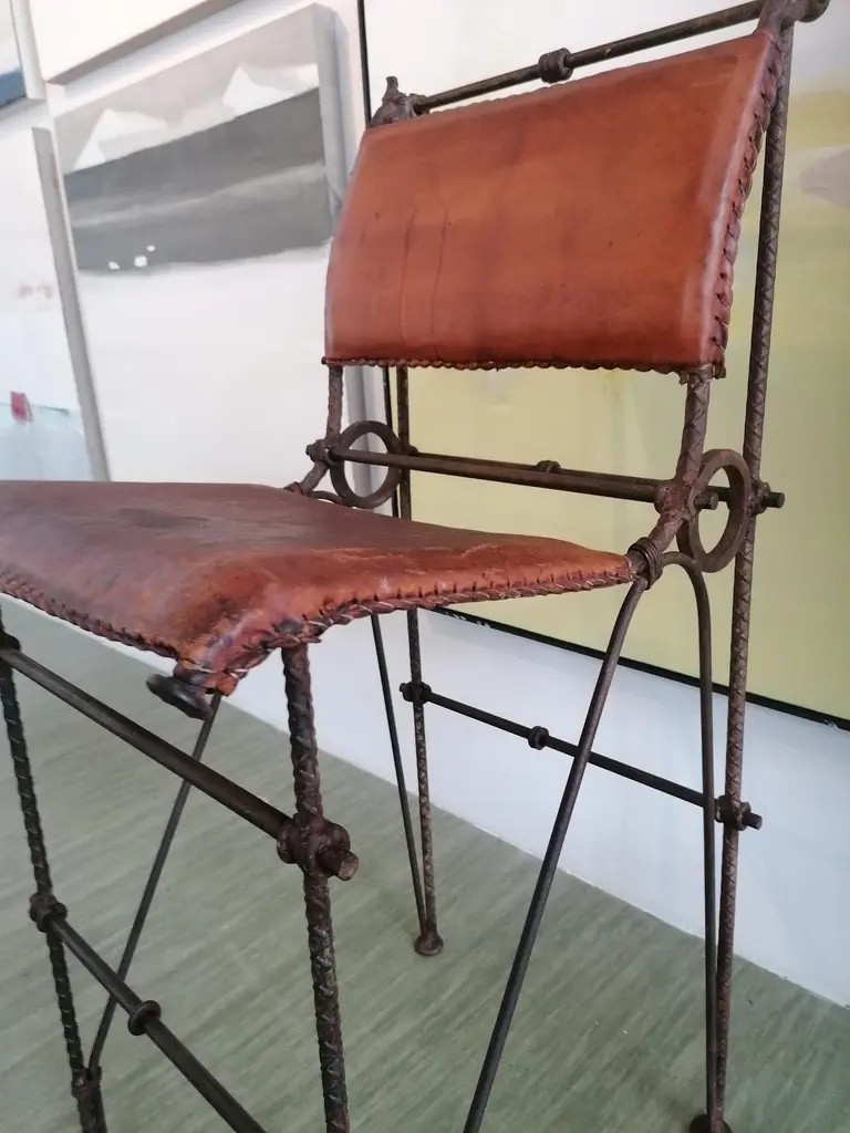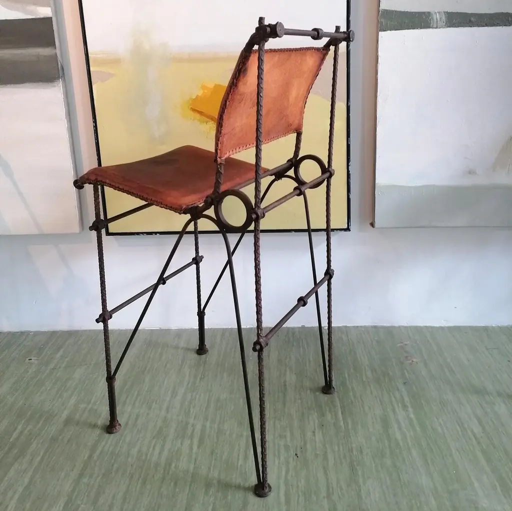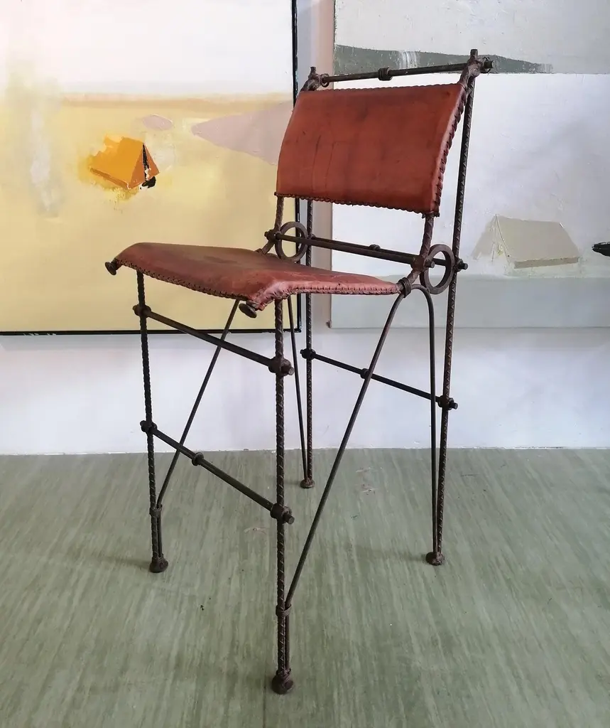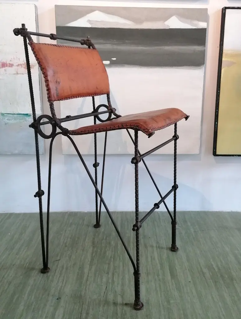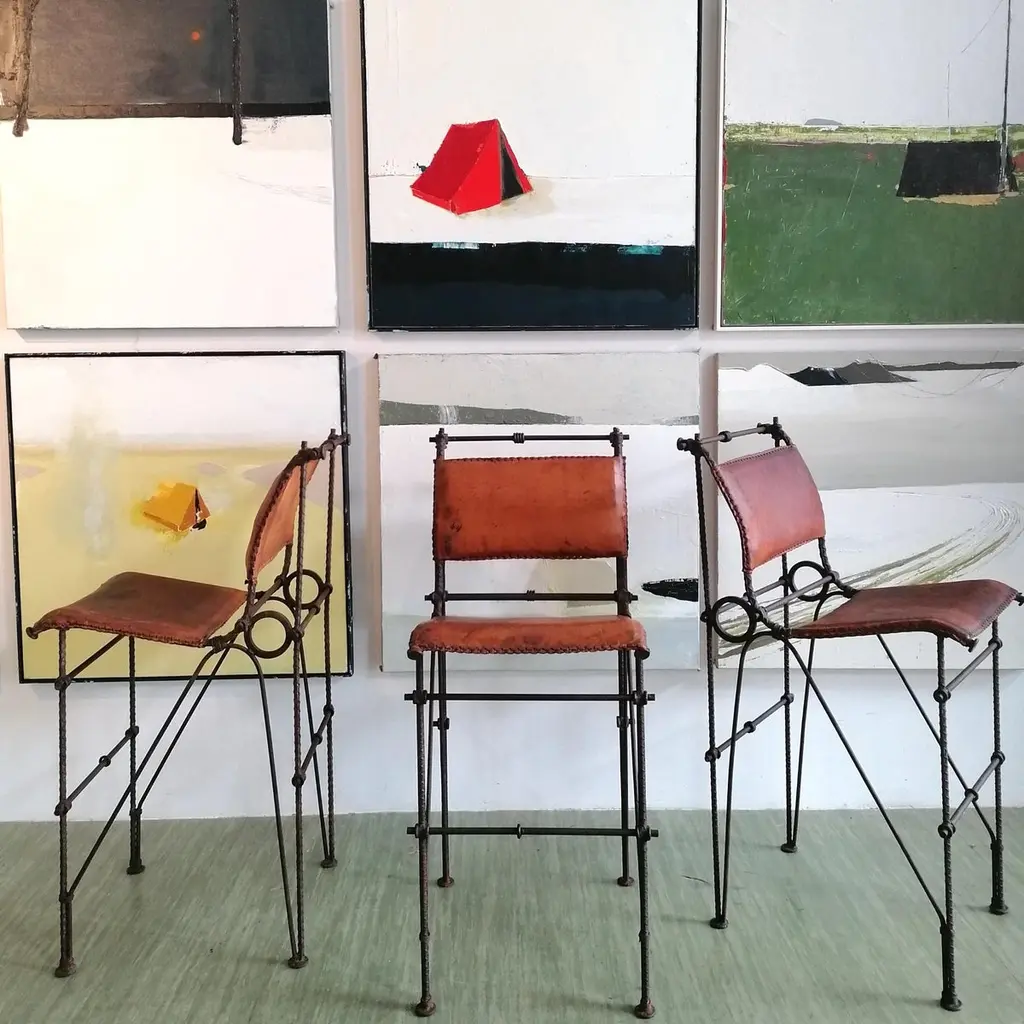 Brutalist Iron & Hide Leather Bar Stools By Ilana Goor, 1970s. Three Available