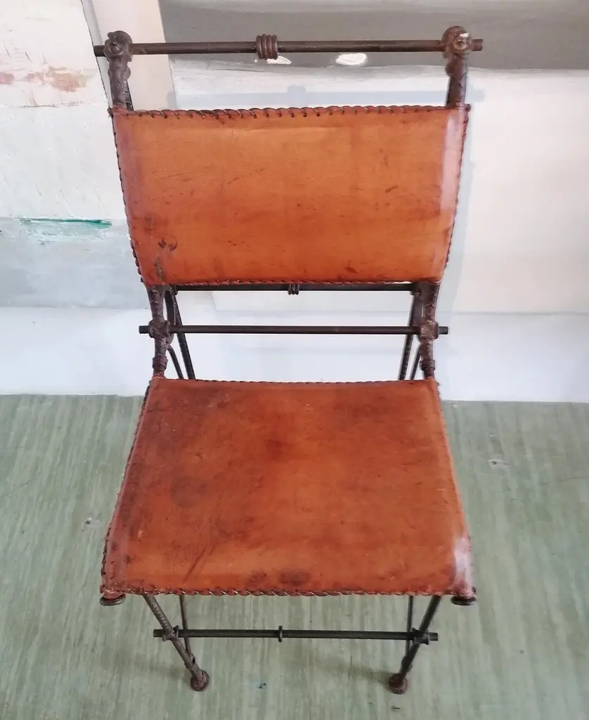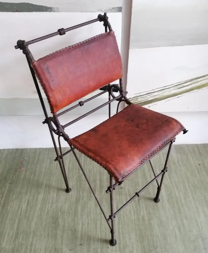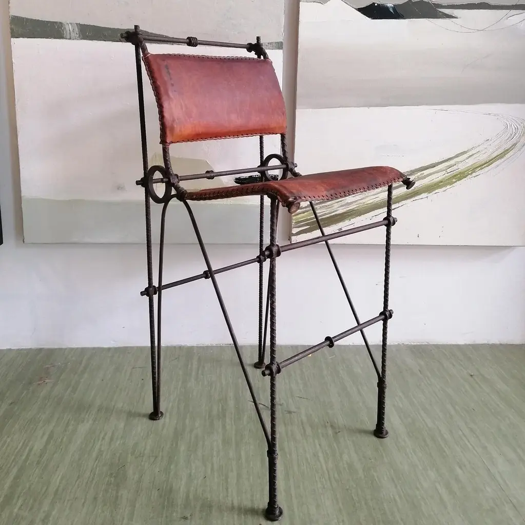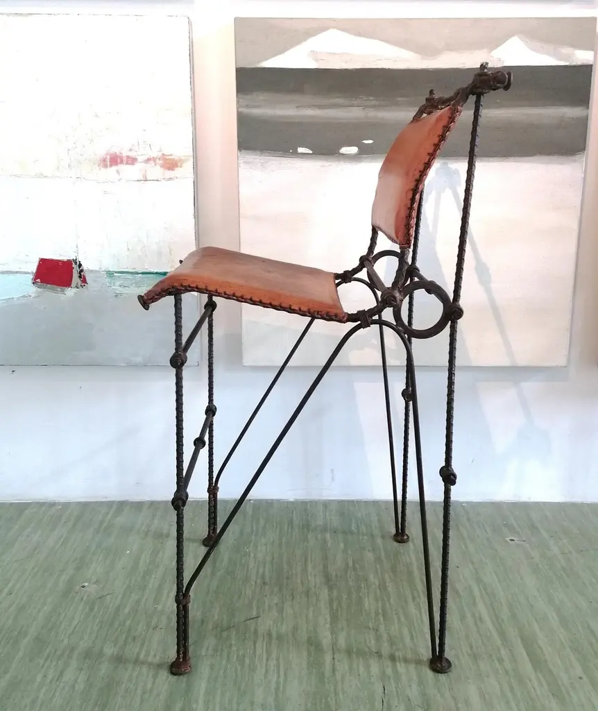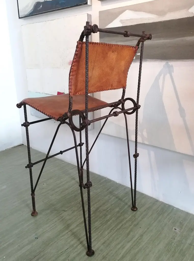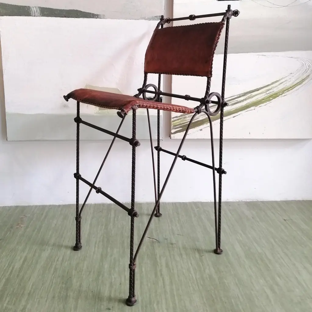 Brutalist Iron & Hide Leather Bar Stools By Ilana Goor, 1970s. Three Available