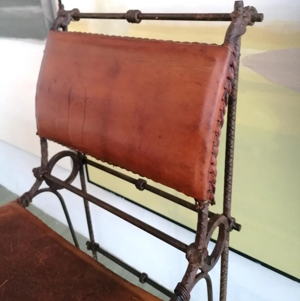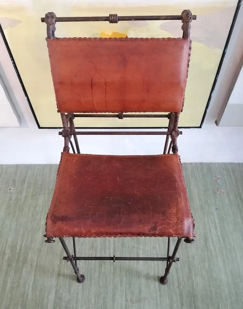 Brutalist iron & hide leather bar stools by Ilana Goor, 1970s. Handmade Rebar iron and steel frame, with beautifully patinated thick whipstitched hide leather seats & backs. Normal amount of age-related wear.Three available: you will be able to select your choice of stool(s). Please note that one stool is missing a horizontal iron bar at the back- this doesn't affect the structural stability.