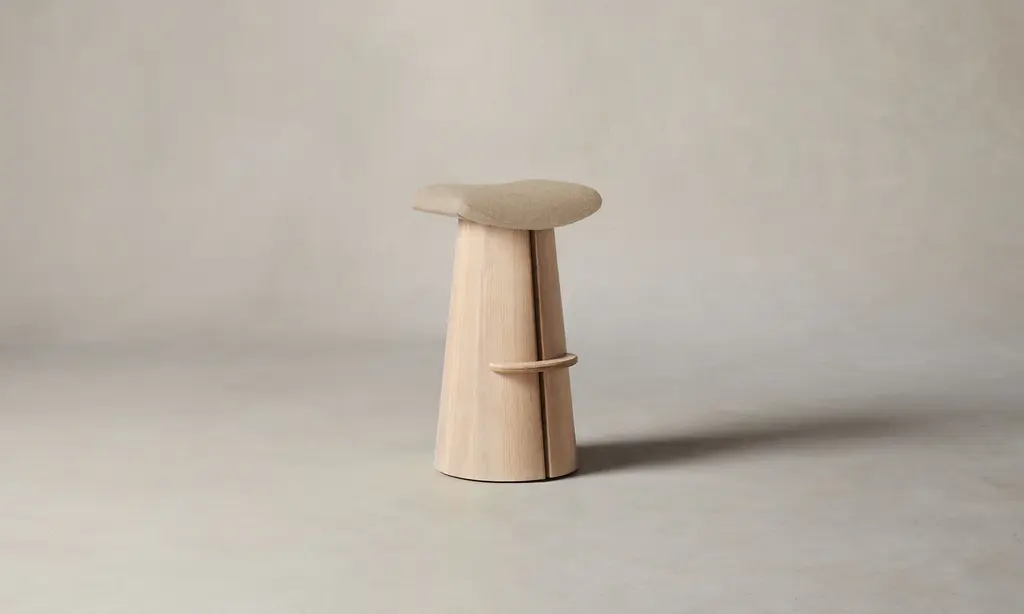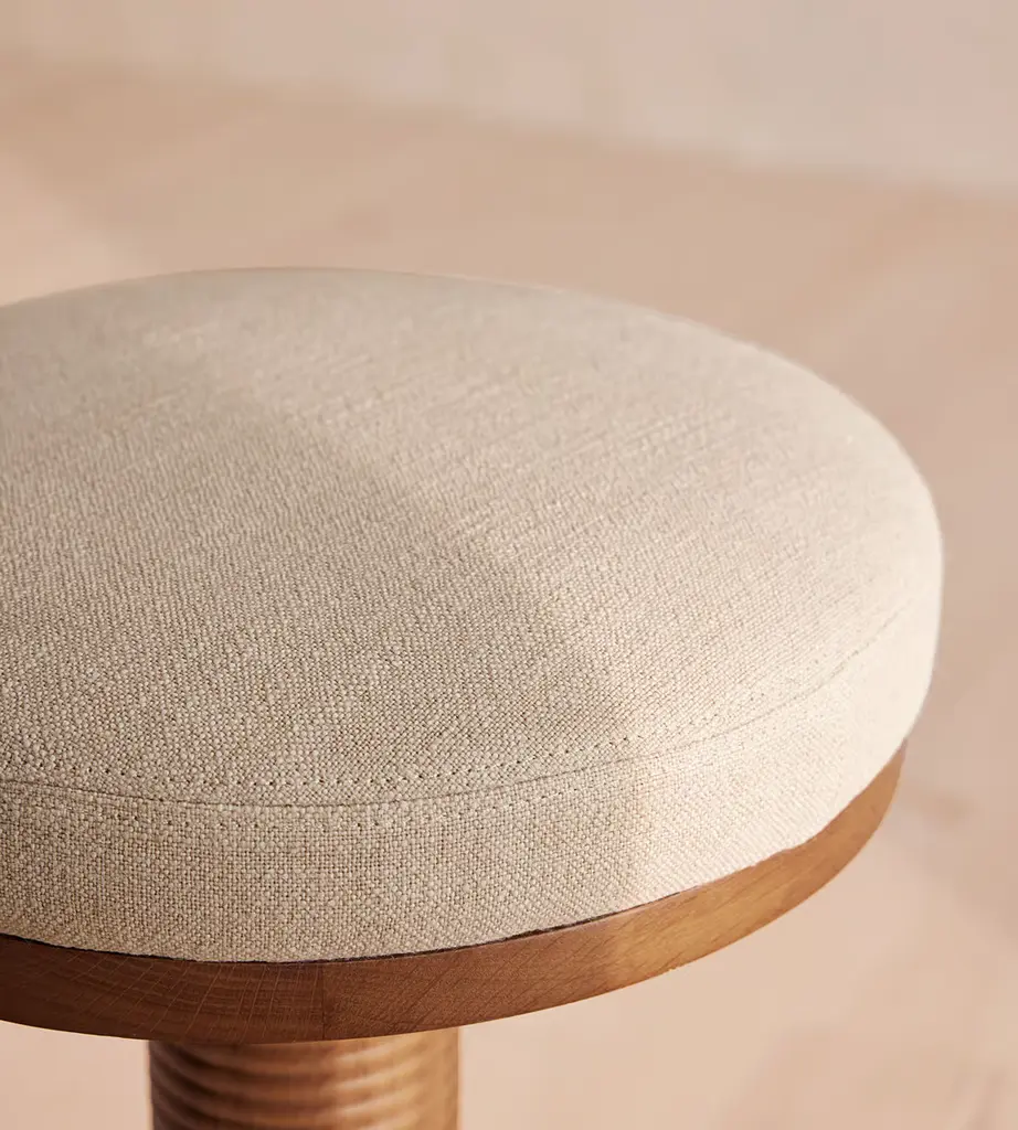 The Bryden bar stool makes a great addition to a breakfast bar. The round, padded linen-blend seat descends into a central wooden column with intricate grooves, while an oak frame supports the antique brass-finish footrest and is anchored by a brass-plated base.